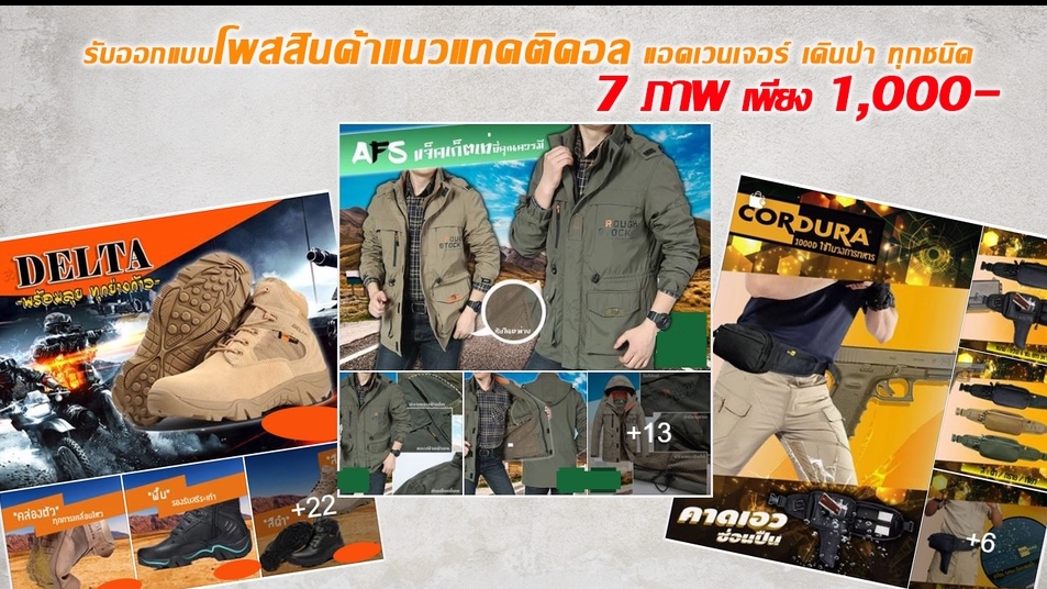 รับออกแบบภาพโฆษณาสินค้าในเพจ แนวแทคติคอล การเดินป่า และแอดเวนเจอร์ทุกชนิด มีการติดคีย์เวิร์ดในภาพ และเช็คภาพการเข้าถึงของโฆษณา เพื่อให้คนเห็นโพสมากที่สุดค่ะ รายละเอียดราคาเพิ่มเติม สามารถขอไฟล์ PS ได้ สามาถแก้ไขงาน ได้ 1-2 ครั้ง ขั้นตอนการทำงาน 1. สอบถามรายละเอียด ขอบเขตงานที่ต้องการ เช่น โทนสี รูปภาพ ข้อมูล สินค้า/บริการ รายละเอียดต่างๆ 2. ตกลงราคาและระยะเวลาในการทำงาน ฟรีแลนซ์ทำใบเสนอราคา 3. ลูกค้าชำระเงิน เริ่มทำงานตามที่ตกลงกันไว้ 4. ส่งงาน 5. ผู้จ้างงานตรวจสอบ หากมีการแก้ไข แจ้งรายละเอียดในการแก้ 6. แก้ไขงาน ส่งงานที่แก้ไขให้ผู้จ้างงาน