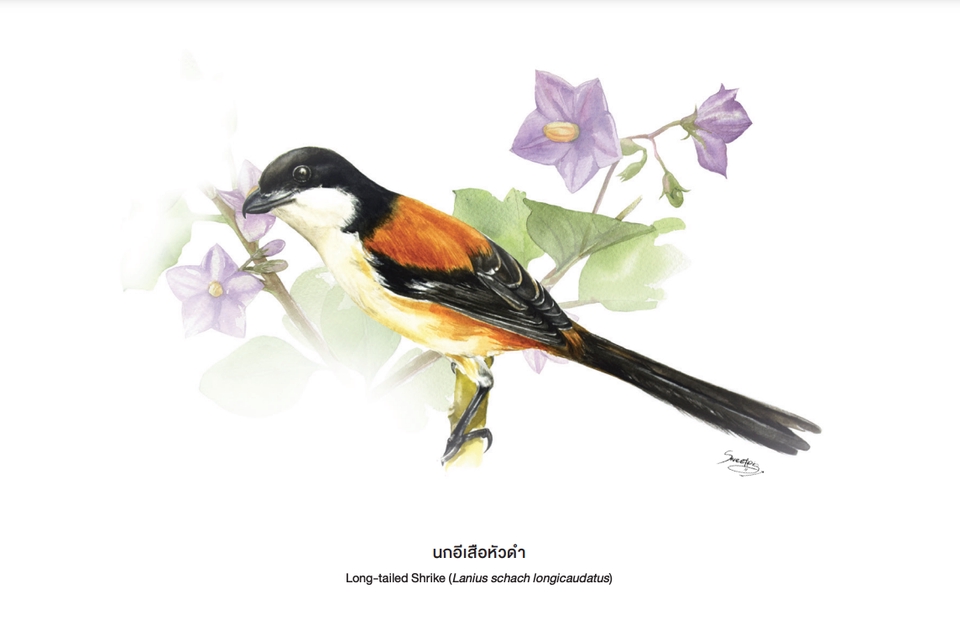 ภาพประกอบภาพวาดเทคนิกสีน้ำบนกระดาษ (Watercolor) นกชนิดต่าง ๆ แบบลงรายละเอียดของตัวนกชนิดนั้นชัดเจนพร้อมสภาพที่อยู่อาศัย (Habitat) หรืออาหารที่นกชนิดนั้นกิน ราคาคิดตามขนาดและความละเอียดของภาพ -ขนาด A5 (14.8 x 21 ซม.) ราคา 500-1,000 บาท -ขนาด A4 (27 x 21.7 ซม.) ราคา 1,000-2,000 บาท -ขนาด A3 (31 x 42 ซม.) ราคา 2,500 - 3,500 บาท ขั้นตอนการทำงาน 1. ตกลงรายละเอียดของชนิดนกที่ต้องการ 2. ออกแบบร่างเส้นแสดงลักษณะสำคัญของนอกชนิดนั้น และจัดองค์ประกอบ (แสดงภาพร่างให้ลูกค้าดู ปรับแกได้ 2 ครั้ง) 3. เริ่มลงสีและเก็บรายละเอียด 4. ส่งงาน final ให้เช็คความเรียบร้อย 5. จัดส่งภาพวาดผ่าน EMS พร้อมแพคอุปกรณ์ป้องกันความเสียหายอย่างดี