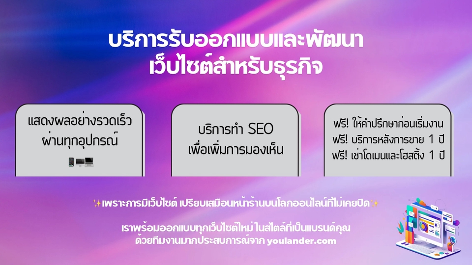 ✨ เพิ่มยอดขาย เพิ่มความน่าเชื่อถือ ด้วยการสร้างเว็บไซต์สำหรับธุรกิจ ✨ ในยุคนี้ที่ลูกค้าล้วนค้นหาทุกอย่างผ่าน Google ปฏิเสธไม่ได้เลยว่า ธุรกิจที่ไม่มีเว็บไซต์กำลังพลาดโอกาสเข้าถึงกลุ่มลูกค้าอย่างน่าเสียดาย พวกเราจาก Youlander.com ผู้ให้บริการสร้างเว็บไซต์สำหรับธุรกิจที่หลากหลาย เราพร้อมออกแบบเว็บไซต์ที่รังสรรค์ขึ้นเพื่อร้านของคุณโดยเฉพาะ ด้วยบริการแบบครบวงจร พร้อมการดูแลต่อเนื่องหลังส่งมอบงาน ไม่ว่าคุณจะเป็นเจ้าของร้านนวด ร้านสปา ร้านทำผม ที่พัก หรือธุรกิจใดก็แล้วแต่ เรายินดีเป็นส่วนหนึ่งเพื่อสร้างตัวตนให้ธุรกิจคุณบนโลกออนไลน์ สิ่งที่คุณจะได้รับเมื่อสร้างเว็บไซต์กับเรา: ✅ เพิ่มการมองเห็นเมื่อลูกค้าค้นหาผ่าน Google ด้วยการรองรับ SEO ✅ ตอบสนองการใช้งานบนทุกอุปกรณ์อย่างรวดเร็ว ✅ แสดงผลด้วยภาษาอังกฤษ เหมาะกับการขยายฐานลูกค้าต่างชาติ (หรือเลือกเพิ่มภาษาได้) ✅ ฟรี! โดเมนและโฮสติ้ง 1 ปี ✅ ฟรี! บริการหลังการขาย 1 ปี ✅ ฟรี! ให้คำปรึกษาตลอดช่วงเวลาให้บริการ ✅ ส่งมอบงานอย่างรวดเร็ว เพราะการมีเว็บไซต์ เปรียบเสมือนหน้าร้านบนโลกออนไลน์ที่ไม่เคยปิด บริการโดยทีมงานผู้เชี่ยวชาญ เบื้องหลังผู้สร้างเว็บไซต์ให้กับธุรกิจในหลายประเทศ