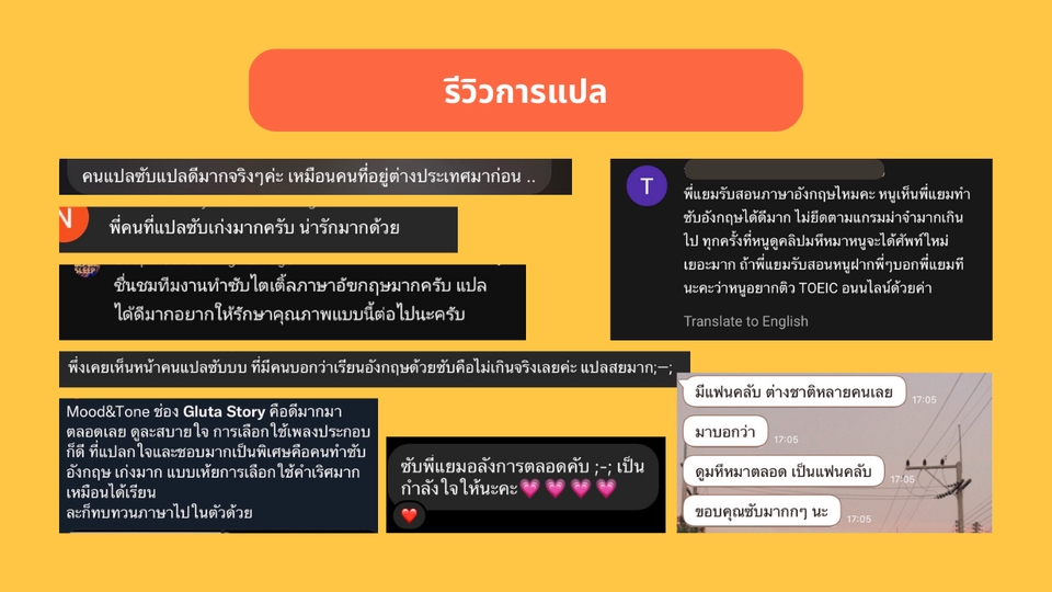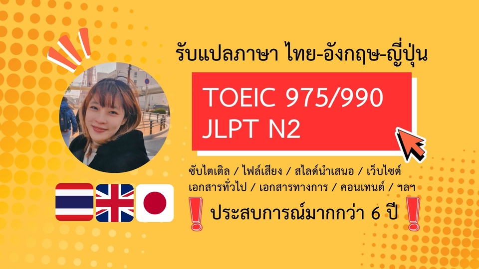 รายละเอียดงาน - แปลภาษา : ไทย-อังกฤษ | อังกฤษ-ไทย | ญี่ปุ่น-อังกฤษ | ญี่ปุ่น-ไทย - แปลวิดีโอซับไตเติล, ถอดและแปลไฟล์เสียง, แปลสไลด์นำเสนอ, เว็บไซต์, เอกสารทั่วไป, เอกสารทางการ, อื่นๆ ตามที่ต้องการ - สามารแปลได้ตั้งแต่งานที่ใช้ภาษาระดับเบื้องต้นไปจนถึงระดับสูง ประสบการณ์และความเชี่ยวชาญ - ประสบการณ์ด้านการแปลกว่า 6 ปี - TOEIC 975/990 - JLPT N2 ตัวอย่างงานแปล - แปล TH-EN ซับไตเติล ช่อง Gluta Story : https://rb.gy/m67qhj - แปล EN-TH ซับไตเติล ช่อง Mission to the Moon : https://rb.gy/qwgcp9 - แปล TH-EN เอกสารบริษัทนำทัวร์ดูสัตว์ป่า - แปล TH-EN เอกสารราชการบริษัทนาฬิกาข้อมือ - แปล JP-TH สไลด์นำเสนอและเอกสารบริษัทญี่ปุ่น ธุรกิจด้านการถือลิขสิทธิ์สินค้า เรทการแปล (ราคาต่อรองได้) - คลิปวิดีโอ/ไฟล์เสียง (EN/JP-TH) : 120-150 บาท / นาที - คลิปวิดีโอ/ไฟล์เสียง (TH/JP-EN) : 150-200 บาท / นาที - เอกสาร/สไลด์ (EN/JP-TH) : 250-400 บาท / หน้า - เอกสาร/สไลด์ (TH/JP-EN) : 400-500 บาท / หน้า ประสบการณ์ด้านภาษานอกจากงานแปล - รับสอน IELTS, TOEFL, TOEIC, JLPT - เขียนบทความท่องเที่ยวภาษาอังกฤษ - Marketing บริษัทญี่ปุ่น ขั้นตอนการใช้บริการ - ส่งเอกสารหรือไฟล์ให้ประเมินราคาและเวลาการทำงาน - ออกใบเสนอราคาหลังตกลงราคาและเวลาการทำงาน - ส่งงานให้ตรวจสอบเมื่อแปลเสร็จ - ปรับแก้จนเป็นที่พึงพอใจต่อผู้จ้างงาน - อนุมัติงานเป็นอันเสร็จสมบูรณ์