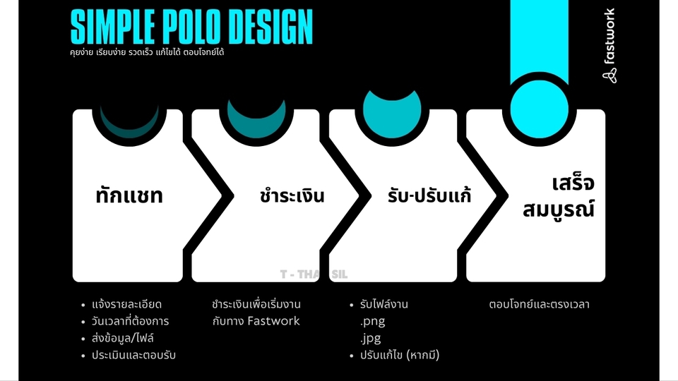 🔺เสื้อสำหรับองค์กร หน่วยงาน ชุดยูนิฟอร์มขององค์กรต่างๆ 🔺เสื้อที่ระลึก เสื้อทีมครอบครัว ในรูปแบบเสื้อโปโล ✴️ สามารถสอบถามได้โดยไม่มีค่าใช้จ่ายเพิ่มเติม ✴️ ขั้นตอนการทำงาน 1. พูดคุย และแจ้งรายละเอียดงานอย่างชัดเจน เช่น ดีไซน์, สีตัวเสื้อ, สีของสาบเสื้อ เป็นต้น 2. ลูกค้าส่งข้อมูลอ้างอิงให้กับฟรีแลนซ์ เช่น รูปภาพ (หากมีเพิ่มเติม) 3. ทางเราจะประเมินเวลาออกแบบ เงื่อนไข และสร้างใบเสนอราคาให้กับลูกค้า 4. ลูกค้ายืนยันการว่าจ้างออกแบบดังกล่าว และลูกค้าดำเนินการชำระเงินฝากไว้ในระบบ 5. เริ่มดำเนินงาน 1-3 วัน และแก้ไขงานตามข้อตกลงที่กำหนดไว้ 6. ผลงานสำเร็จในเวลาตามที่ตกลง และส่งผลงานให้ลูกค้าเป็นไฟล์ PNG , PDF และ JPG