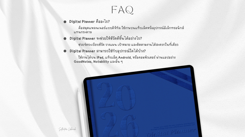 🎉 ขาย Digital Planner 2026 (แถมฟรีสติ๊กเกอร์ในเล่ม) สำหรับดาวน์โหลดใช้งานทันที ! – ไฟล์ PDF สำหรับใช้งานบนแอป GoodNotes/Notability หรืออื่น ๆ เหมาะสำหรับใช้งานบน iPad, Tablet – เหมาะสำหรับการวางแผน รายวัน, รายสัปดาห์, รายเดือน และรายปี – ดีไซน์สวยงาม Minimal/Modern/Aesthetic – ลูกค้าจะได้รับ "ไฟล์ดิจิตอล" พร้อมใช้ (PDF) เท่านั้น ไม่รับผลิตหรือปรับแต่งตามสั่ง – หลังลูกค้าชำระเงินบน Fastwork จะได้รับไฟล์ Digital Planner 2026 (เลือกสีได้) และไฟล์สติ๊กเกอร์ฟรี ทันที – ไฟล์งานสำหรับใช้งานเองเท่านั้น (ไม่อนุญาตให้แก้ไข/ดัดแปลงไฟล์งาน หรือนำไปจำหน่ายต่อทุกกรณี) 🎉 จัดระเบียบชีวิต และงานของคุณให้ปี 2026 ง่าย และสวยงามในไม่กี่คลิก !!