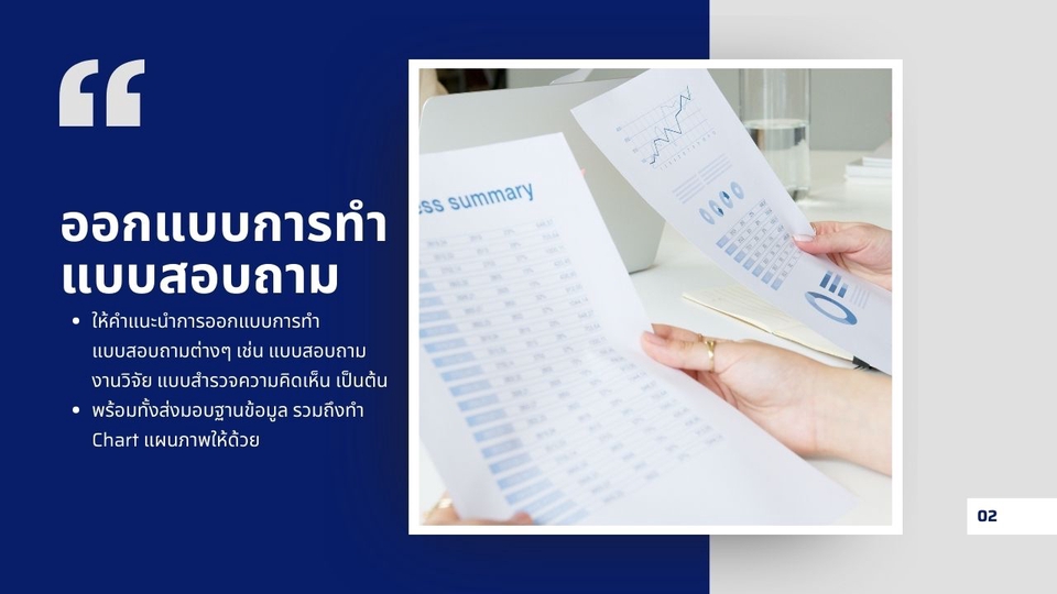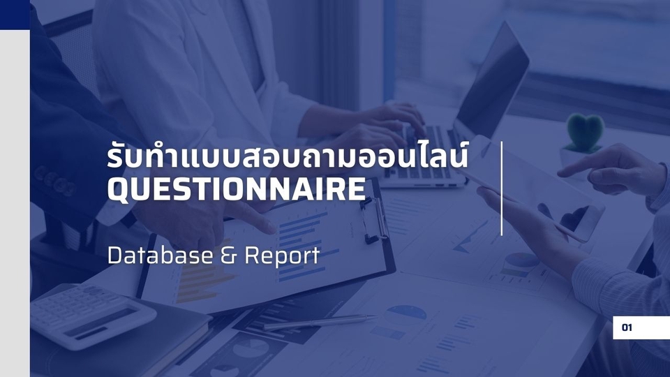 จัดทำแบบสอบถามต่างๆในระบบออนไลน์ เช่น แบบสอบถามงานวิจัย แบบสำรวจความคิดเห็น เป็นต้น ซึ่งสามารถกำหนดรูปแบบของข้อคำถามได้ และหลังจบระยะเวลาของแบบสอบถาม จะจัดทำข้อมูลดิบ Database หรือรูปแบบ Chart แผนภาพ ส่งให้ ** สำหรับข้อคำถามต่างๆ ผู้ว่าจ้างต้องมีคำถามมาให้ ** ขั้นตอนการทำงาน 1. รับรายละเอียดคำถามจากผู้ว่าจ้าง 2. ออกแบบแบบสอบถามให้เหมาะสมกับประเภทของงาน 3. จัดทำแบบสอบถามในรูปแบบออนไลน์ และส่ง url ให้ สามารถนำไปใช้งานได้ 4. กรณีต้องการข้อมูลผลของการตอบแบบสอบถาม จะจัดส่งให้เมื่อเสร็จโครงการ 5. กรณีต้องการ Report รูปแบบ Chart แผนภาพ จัดทำให้