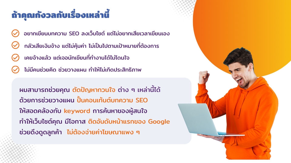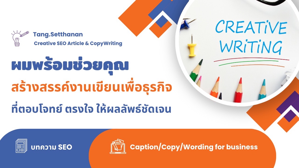 ผมช่วยให้ผู้ประกอบการธุรกิจ SMEs ที่ไม่ถนัดด้านการทำการตลาด การวางแผนและผลิตคอนเท้นต์ การสื่อสารผ่านช่องทางต่าง ๆ ให้มีเวลาไปโฟกัสกับการวางแผนพัฒนาธุรกิจให้เติบโต ประหยัดงบโฆษณาประชาสัมพันธ์ โดยมีผมเป็นผู้ช่วยและที่ปรึกษา ทำหน้าที่วางแผน สร้างสรรค์ และปรับปรุงประสิทธิภาพ ในด้านเนื้อหาและการสื่อสาร เพิ่มความน่าสนใจ ปิดการขายได้ง่ายและไว ตอบโจทย์เป้าหมายธุรกิจที่หลากหลาย ในแต่ละช่วงเวลา ด้วยบริการ 2 ประเภท 1. เขียบบทความ SEO ตามจำนวนคำที่คุณต้องการ พร้อมสอดแทรก Keyword ที่กลุ่มลูกค้าใช้ค้นหาบ่อย ๆ และออกแบบภาพปก (Thumbnail) และภาพประกอบ เพื่อเพิ่มความน่าสนใจ 2. คิดคำ (Caption/Wording/Copy) สำหรับโฆษณาประชาสัมพันธ์สินค้า และบริการ โดยการวิเคราะห์ลูกค้า ค้นหาปัญหาและ Painpoint วิเคราะห์จุดแข็งของสินค้าและบริการที่ช่วยแก้ไข และคิดสร้างสรรค์คำ โดยอาศัยหลักจิตวิทยาการขาย การตลาด และ StoryTelling พร้อมสร้าง Reference เพื่อเป็นแนวทางสำหรับออกแบบกราฟฟิค กระบวนการทำงาน 1. รับบรีฟข้อมูล ความต้องการจากลูกค้า 2. ลูกค้าส่งข้อมูลเพิ่มเติม เพื่อการวิเคราะห์กลุ่มเป้าหมาย (Customer Insight) วิเคราะห์ข้อมูลสินค้าและบริการ ทำความเข้าใจแบรนด์ เพื่อการสื่อสารที่มีประสิทธิภาพ 3. สร้างสรรค์งานตามที่ลูกค้าต้องการ 4. ส่งงานให้ลูกค้าพิจารณารอบแรก แก้ไขได้ในส่วนที่ต้องการปรับปรุง (1 ครั้ง) *** หากมีการแก้ไขในลักษณะนอกเหนือจากที่บรีฟไว้ จะมีค่าใช้จ่ายเพิ่มเติม 5. ส่งงานฉบับสมบูรณ์