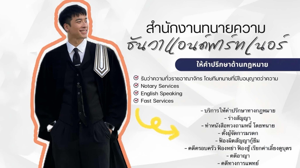 ให้บริการรับทวงหนี้ทั่วประเทศอย่างถูกต้องตามกฎหมาย ด้วยวิธีการทำหนังสือทวงถาม หรือโนติส [Notice ] และส่งไปยังภูมิลำเนาของลูกหนี้ เพื่อทวงถามให้ชำระหนี้ ✅ข้อดี 👉🏻ไม่ต้องเสียเวลาไปศาล 👉🏻หากลูกหนี้ยอมชำระไม่ต้องเสียค่าใช้จ่ายในการฟ้องคดี 👉🏻ถ้าลูกหนี้ยังไม่ชำระสามารถดำเนินการฟ้องร้องคดีได้ ขั้นตอนการทำงาน 1. สอบข้อเท็จจริงจากผู้จ้างถึงมูลเหตุการกู้ยืมเงิน 2. เมื่อทนายได้ข้อมูลครบถ้วนแล้ว จะดำเนินการหาที่อยู่ของลูกหนี้ และจัดทำหนังสือบอกกล่าวทวงถามหนี้ 3. หลังจากทำหนังสือบอกกล่าวทวงถามหนี้เสร็จแล้ว ทนายจะส่งงานเป็นไฟล .pdf ให้แก่ผู้จ้าง