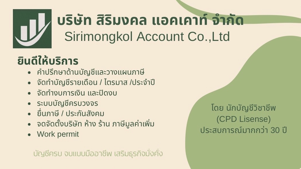 จัดทำ บัญชี บริษัท ห้าง ร้าน นิติบุคคล ทั้งรายเดือนและรายปี ยื่นภาษีต่างๆ จดจัดตั้ง/เปลี่ยนแปลงบริษัท
