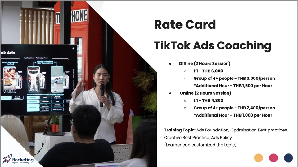ประสบการณ์ การทำงานที่ TiKTok ประเทศไทย มากเกือบ 4 ปี เข้าใจระบบการทำงานของ platform เป็นอย่างดี สามารถให้คำแนะนำการทำโฆษณาได้ทั้งการทำ Awareness (สร้าง Brand) หรือปิดการขายไปที่ TikTok Shop ขั้นตอนการทำงาน 1. Kick off call พูดคุยเพื่อทำความรู้จักกับแบรนด์และเข้าใจถึงวัตถุประสงค์ในการทำโฆษณาของลูกค้า 2. ทำการ set up บัญชีโฆษณา 3. สร้างโฆษณา (วิดีโอสำหรับโฆษณษา ลูกค้าเตรียม) 4. วัดผลโฆษณาเป็นระยะ 5. ครบ 30 วันนัดพูดคุยเกี่ยวกับ ads performance & Recommendation