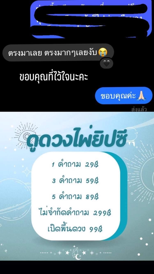 ดูดวงไพ่ยิปซี ไพ่ออราเคิล ถามได้ทุกคำถาม เปิดไพ่ทันทีไม่มีรอคิว เปิดไพ่เองไม่ผ่านเอไอ ไม่ผ่านเว็ป เปิดเองอ่านเอง ตอบเอง ด้วยแม่หมอเองจริงๆ ดูเกี่ยวกับเรื่องเรียน งาน เงิน ความรัก สุขภาพ เป็นภาพรวม หรือถามเจาะจง เรื่องลี้ลับผีสาง ทำธุรกิจซื้อบ้านที่ดิน รถ ได้หมดค่ะ ขั้นตอนการทำงาน 1. เลือกพ็กเกจที่ต้องการ ชำระเงิน 2. ระบุชื่อเล่น อาย ความรักสถานะ: การงาน/เรียน(ระดับไหน): 3. หากเป็นแบบโทรนัดวันและเวลาที่ลูกค้าสะดวก