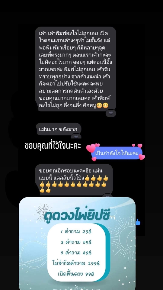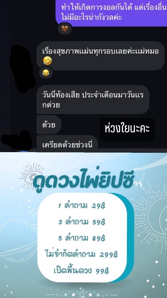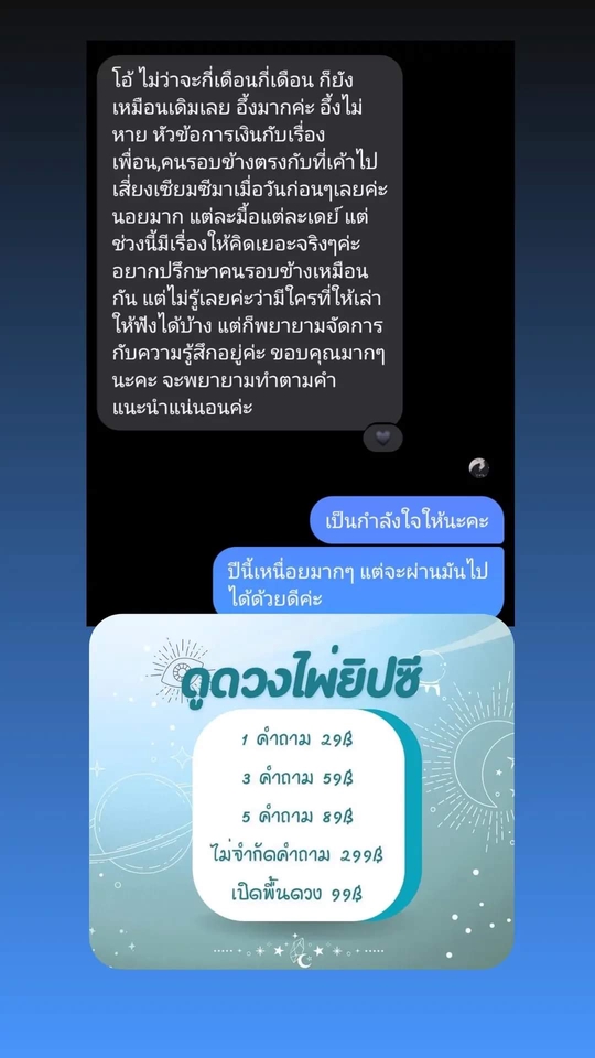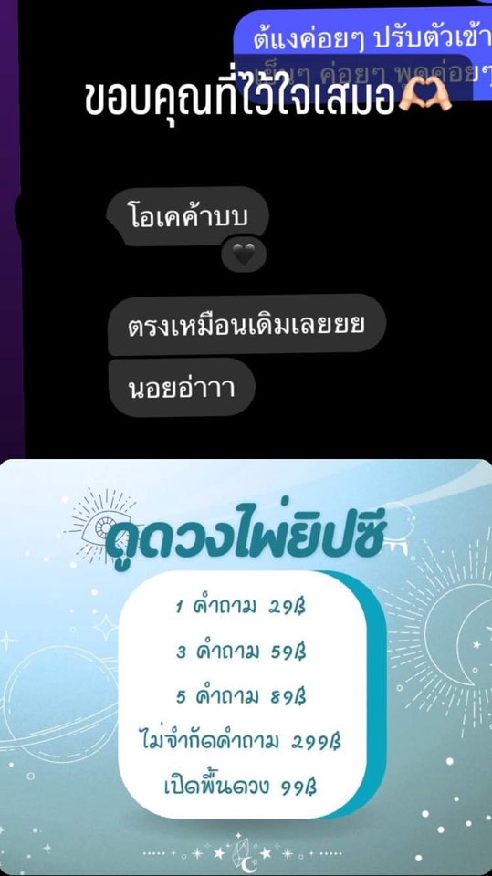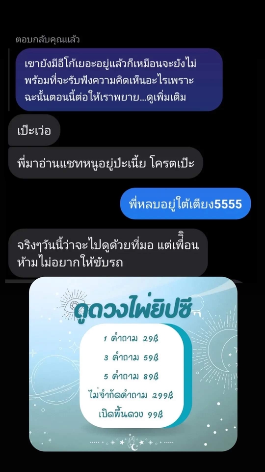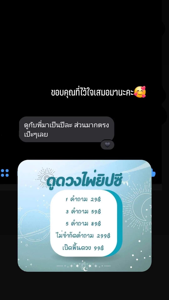 ฿4991. เปิดพื้นดวงดูภาพรวมให้ (ไม่รวมในถามคำถาม 30 นาที) 2. ถามไม่จำกัดคำถาม 30 นาที 3. เลือกได้ว่าใช้ไพ่ยิปซี หรือไพ่ออราเคิล