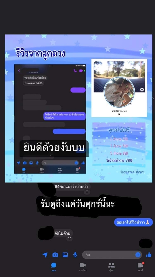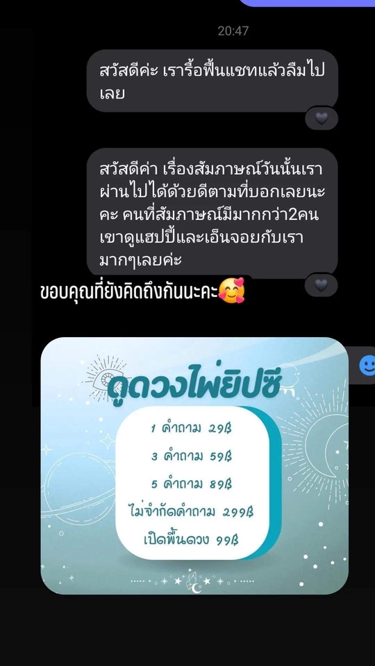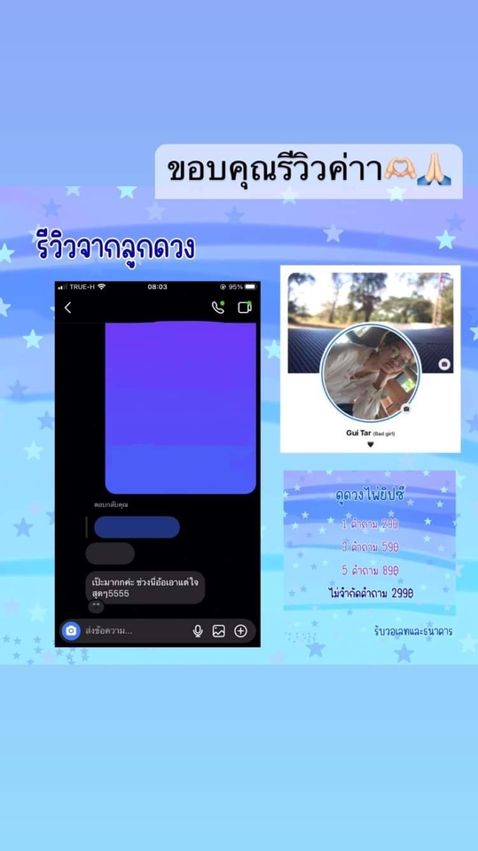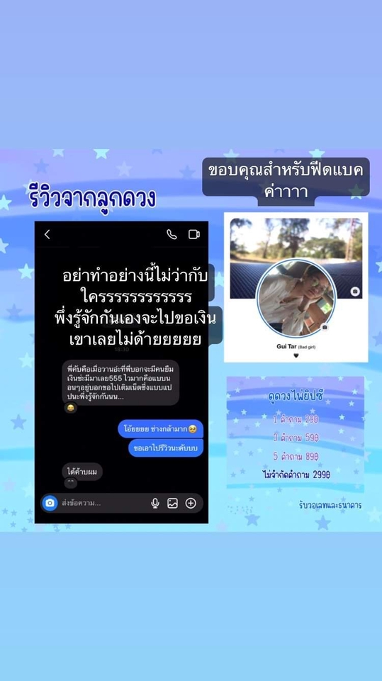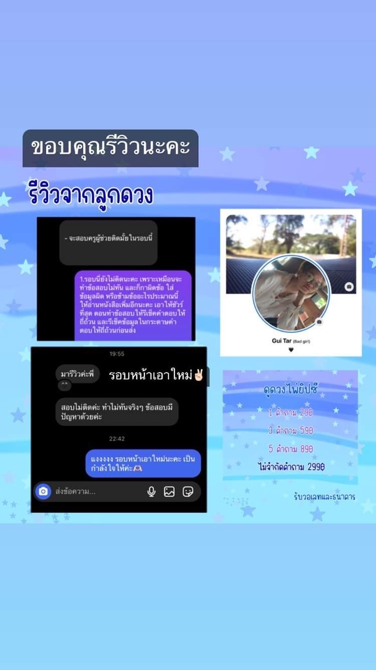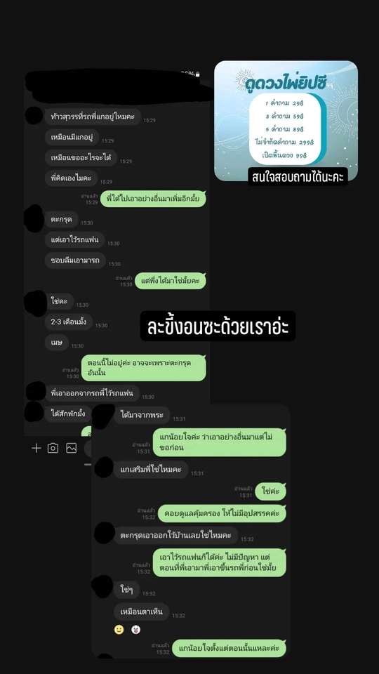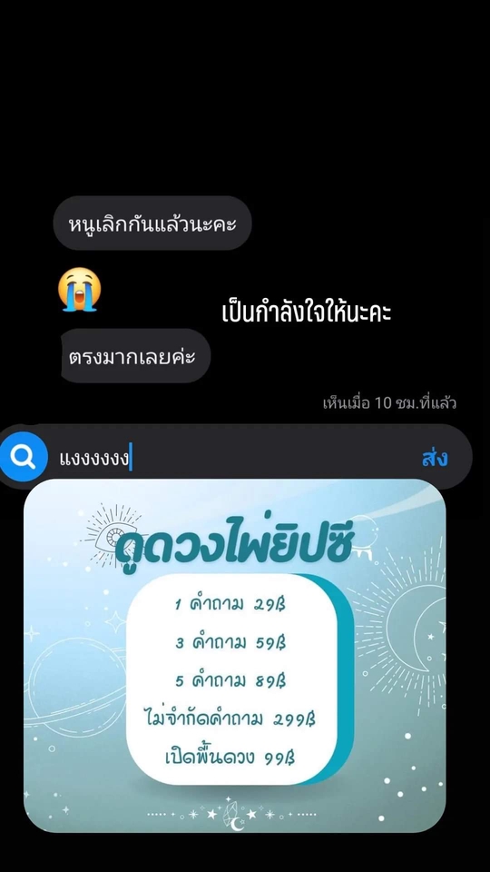 ฿4991. เปิดพื้นดวงดูภาพรวมให้ (ไม่รวมในถามคำถาม 30 นาที) 2. ถามไม่จำกัดคำถาม 30 นาที 3. เลือกได้ว่าใช้ไพ่ยิปซี หรือไพ่ออราเคิล