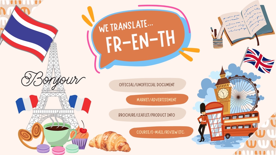 รับแปลภาษา FRENCH - ENGLISH - THAI 🚩🚩 เอกสารราชการที่ต้องได้รับการรับรองจากกงสุล ลูกค้าเลื่อนผ่านได้เลยค่ะ ✔️ สะดวกตอบแชทตั้งแต่ 06:00-22:00 เวลาประเทศไทยนะคะ ทักมาช่วงเวลานอน กรณีเวลาลูกค้ากับ Freelance ไม่ตรงกัน ขออนุญาตตอบช้า ไม่ว่ากันนะคะ 💤 (ᴗ˳ᴗ)ᶻ𝗓𐰁 💤 ✖️ รบกวนไม่กด "ทักแชทฟรีแลนซ์" เล่นนะคะ กดแล้วคุยกันได้ค่ะ 😅😅😅 ✔️ ราคาคุยกันตรงๆได้เลยนะคะ ได้ราคามาเท่าไหร่ อยากให้ลดลงเท่าไหร่ ตรงๆไม่อ้อมค้อมกันนะคะ จะได้ไม่ยืดเยื้อกันค่ะ 💲💲 ถ้าคิวงานว่าง ฟรีแลนซ์จัดให้ค่ะ 📌📌📌 🌿🌿🌺🌺🌾🌾🍃🍃 ขั้นตอนการทำงาน 1. ส่งไฟล์ที่ต้องการแปล พร้อมคุยรายละเอียดงาน ปริมาณงาน และกรอบเวลาการทำงาน 2. เริ่มทำงานหลังจากชำระเงินหรือสถานะบนหน้าแชทเปลี่ยนจาก "ชำระเงิน" เป็น " เริ่มทำงาน " 3. ส่งงานให้ตรวจสอบ สามารถแก้ไขงานได้ 1 ครั้ง (ถ้ามี) 4. เลือก Format งาน ส่งมอบงานให้ลูกค้า 5. ถูกใจงาน Review ให้กำลังใจกันนิดนึงนะคะ ^___^