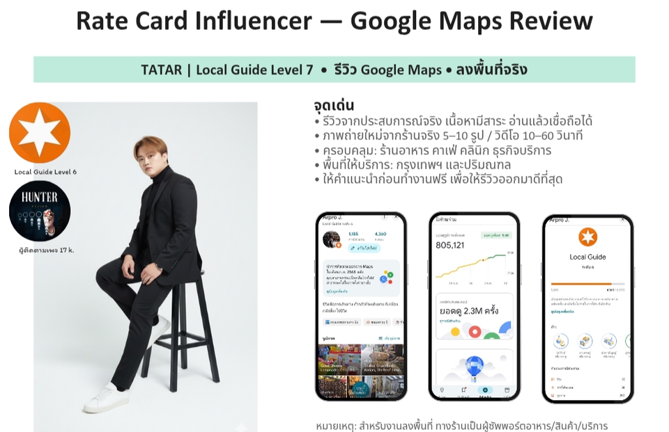 รับรีวิวใน Google Map 5ดาว ข้อความและภาพถ่าย จะเป็นรีวิว 5 ดาว พร้อมแคปชั่นตามที่ลูกค้าต้องการ พร้อม รูปภาพที่ลูกค้าต้องการให้โพสต์ ** รีวิว Local Guide ระดับ 7 และ ระดับ 6 จำนวน 2 บัญชีคับ บัญชีละ 1 รีวิว เพื่อช่วยในการมองเห็น หากร้านหรือธุรกิจของลูกค้ามีรีวิวจำนวนดาวเยอะ ขั้นตอนการทํางาน 1. ลุูกค้าทักมาสอบถามรายละเอียดงาน 2. ตกลงสั่งซื้อ 3. ลูกค้าส่งลิ้งค์ Google maps ,ภาพถ่าย และข้อความ รีวิวที่ต้องการ 4. รอดําเนินการ ตามระยะเวลาที่ระบุ