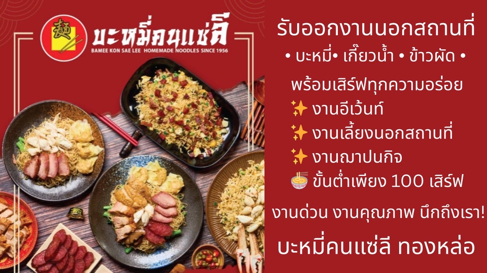 พร้อมเสริฟครบทุกความอร่อย ✨ งานอีเว้นท์ & งานเลี้ยง นอกสถานที่ 🥢 ขั้นต่ำ 100 เสิร์ฟ ราคาตามหน้าร้าน คละเมนูได้ ⚡ งานด่วน งานคุณภาพ นึกถึงเรา! 🍜 บะหมี่คนแซ่ลี ทองหล่อ 🥡Mee Club หมี่คลุกหมูสับ 🍳Wok Club กะเพราหมูสับ แกงไก่ ไข่พะโล้ 🍤 Crush: I'm fried, thank you. And you? 🍹Tasty Street Fruits เครื่องดื่มสมุนไพร น้ำผลไม้
