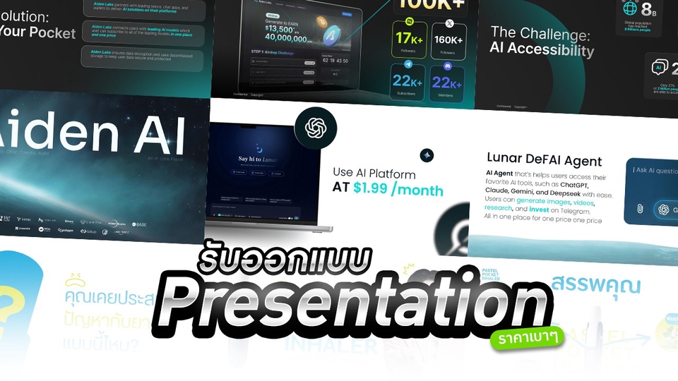 เราเสนอบริการ PowerPoint Design ที่ทันสมัยและเหมาะสมสำหรับภาคเอกชน ภาครัฐ หรือ StartUp ที่ต้องการเพิ่มความมืออาชีพให้กับงานนำเสนอของพวกเขา ทางเรามีประสบการณ์และความเชี่ยวชาญในการทำให้งานนำเสนอของคุณกลายเป็นผลงานที่น่าประทับใจ และตอบสนองต่อความต้องการของลูกค้าอย่างครบวงจร ด้วยเทคนิคการออกแบบที่ทันสมัยและการนำเสนอที่เป็นระบบ เรามุ่งมั่นที่จะสร้างประสบการณ์การนำเสนอที่น่าจดจำและมีคุณค่าสูงสุดสำหรับลูกค้าทุกท่าน ขั้นตอนการทำงาน 1. สอบถามความต้องการลูกค้า/บรีฟ 2. คิดหาไอเดียตามที่ลูกค้าต้องการ 3. เสนอไอเดียให้ลูกค้า 4. เมื่อลูกค้าเข้าใจไอเดียจึงเริ่มออกแบบ