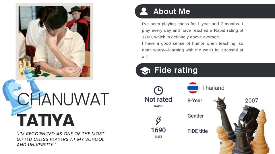 ผมเล่นหมากรุกมานาน เล่นทุกวันจนสามารถึง Rapid 1700.. ได้ ซึ่งถือว่าเก่งกว่าคนธรรมดาทั่วไปแน่นอน ผมมีอารมณ์ขันตอนสอน ไม่เครียดแน่นอนครับถ้าได้มาเรียนกับผม มีประสบการณ์การสอนมานาน