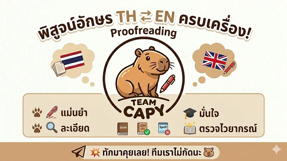 สวัสดีค่า! พวกเราคือ Team Capy กลุ่มเพื่อนสนิทที่จบมาจากอักษรศาสตร์และนิเทศศาสตร์ รวมตัวกันทำฟรีแลนซ์เพราะชอบทำงานด้วยกัน (และคาปีบาราก็ชอบอยู่เป็นฝูง 🐾) ไม่ว่าจะเป็นงานเขียน แปลภาษา คอนเทนต์ กราฟิก สคริปต์ หรืออะไรก็ตามที่คุณคิดว่าเราน่าจะทำได้ — ลองมาคุยกันก่อนได้เลยนะคะ ไม่กัด รับงานอะไรบ้าง? ถามมาเลยค่า เราพิจารณาทุกงาน ✌️ 📩 มีงานอยู่ในใจ? ทักมาคุยได้เลย ไม่ต้องเกรงใจ