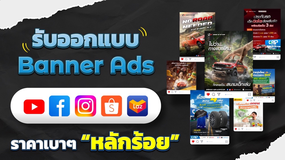 รับออกแบบ Banner สื่อโฆษณาออนไลน์ต่างๆ FB,IG,Shopee,Lazada รูปประเภทงานคอนเทนต์ งานยิงแอดขายสินค้า หรือภาพ Artwork สวยๆ ไว้โปรโมทสินค้า สามารถต่อรองราคาได้ สอบถามรายละเอียดเพิ่มเติมได้เลยนะคะ **สิ่งที่ลูกค้าต้องเตรียม** - โลโก้แบรนด์ - รูปที่ใช้ (สินค้า นางแบบ สถานที่) (ถ้ามี) เงื่อนไข - แก้ไขชิ้นงานได้ 3 ครั้ง/รูป (แก้ครั้งที่ 4 คิด 100฿/รูป) - ขอไฟล์ .psd = 250฿ (ต่อ1ไฟล์) - ปรับไซส์รูป +เพิ่ม 100 ขั้นตอนการทำงาน 1. แจ้งรายละเอียดงาน ขนาดชิ้นงาน ส่งเรฟงานที่ต้องการ 2. ออกแบบ 3. ส่งตัวอย่างงาน 4. แก้ไข 5. ส่งงาน