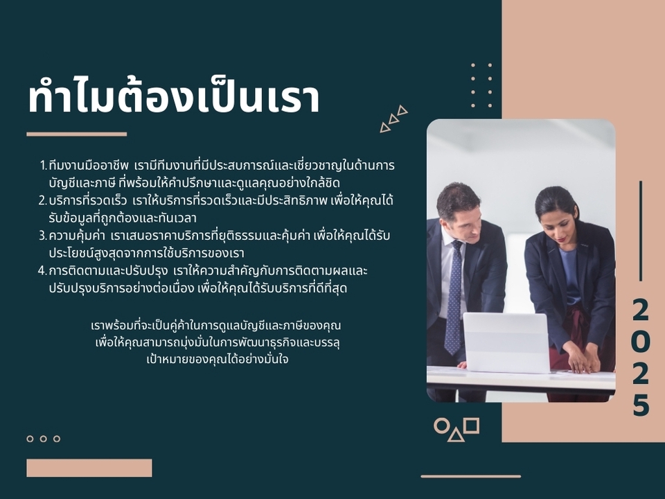 หากกำลังมองหาบริการรับทำบัญชีที่ครอบคลุมทุกความต้องการ ตั้งแต่ การบันทึกบัญชี จัดทำงบการเงิน ยื่นภาษี ไปจนถึงให้คำปรึกษาด้านบัญชีและภาษี โปรดพิจารณาบริการของเรา ด้วยประสบการณ์มากกว่า 20 ปี สามารถทำบัญชีและยื่นภาษีได้อย่างถูกต้อง เป็นไปตามหลักเกณฑ์ของกฎหมาย และสามารถนำไปใช้ประโยชน์ทางธุรกิจได้อย่างมีประสิทธิภาพ หรือช่วยวางระบบบัญชีและภาษี ให้ธุรกิจได้เติบโตได้อย่างยั่งยืน นอกจากนี้ เรายังมีบริการเพิ่ม ที่ไม่คิดมูลค่า ประกอบไปด้วย บริการขึ้นทะเบียนผู้ทำบัญชี บริการยื่นงบการเงินทางอิเล็กทรอนิกส์ (DBD e-Filing) บริการยื่นแบบและชำระภาษีผ่านอินเทอร์เน็ต และบริการปรึกษาปัญหาด้านบัญชีและภาษี ขั้นตอนการทำงาน 1. คุยรายละเอียดงาน เพื่อให้ทราบความต้องการของลูกค้า 2. ประเมิณค่าบริการทำบัญชีและสอบบัญชี 3. ทำใบเสนอราคา หลังชำระค่าบริการจะให้ติดต่อทางไลน์ 4. เริมกระบวนการรับเอกสาร และบันทึกบัญชีในโปรแกรมบัญชี