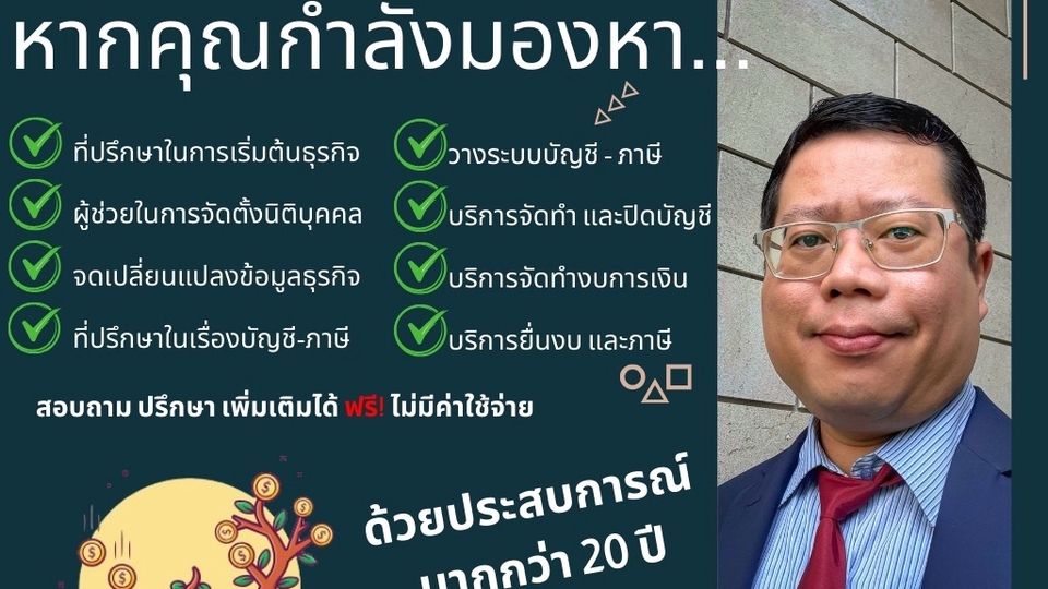 ด้วยประสบการณ์ด้านการทำบัญชีปิดบัญชี และจัดทำงบการเงิน เป็นเวลากว่า 20 ปี ในธุรกิจขนาดกลาง และ ธุรกิจ SMEs โดยผ่านการทำบัญชีให้บริษัทกว่า 200 บริษัท และเป็นที่ปรึกษาในด้านภาษีอากร
