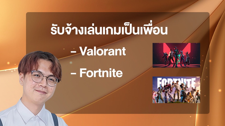 สวัสดีครับชื่อ ธี ครับ ฝีมือเล่นเกมธรรมดาเล่นเรื่อย ๆ เเค่ 2 เกม (หากต้องการเพื่อนคุยไปและเล่นเกมแบบชิล ๆ มาทางนี้ได้เลยครับ) สะดวกช่วงหลัง 19.00 น. เป็นต้นไป สะดวกทุกวันอาทิตย์ครับ *หากมีลูกค้ำประจำอาจจะเพิ่มจำนวนขึ้นในอนาคต* พร้อมเปิดไมค์คุย หรือแชทเฉย ๆ ก็ได้ครับ แนวเกมที่เล่นได้ - Valorant - Fortnite - อื่น ๆ ถ้ามีเสนอครับ ขั้นตอนการทำงาน 1. พูดคุย สอบถาม บอกรายละเอียดงานที่ต้องการ 2. เลือกเกมที่ต้องการเล่น 3. ชำระเงิน 4. แอด Discord 5. เริ่มเล่นเกม/ทำกิจกรรมต่าง ๆ ตามที่ลูกค้าต้องการ 6. อยู่ด้วยจนถึงเวลาจบงาน อาจมีต่อเวลาให้นิดหน่อยหากอารมณ์ในเกมค้างคา 555+
