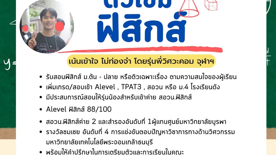 - เพิ่มเกรด/สอบเข้า Alevel Tpat3 สอวน. ฟิสิกส์ ทั้งม.ต้น ม.ปลาย - ให้คำปรึกษาด้านการเตรียมตัวเเละการเรียนในคณะ - สนใจทดลองเรียนได้ก่อนครับ - ราคาต่อรองกันได้ครับ