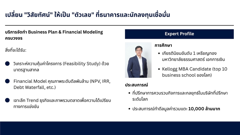 หลายครั้งที่ไอเดียธุรกิจที่ดี กลับไม่สามารถระดมทุนหรือกู้ธนาคารได้เพียงเพราะ "ตัวเลข" และ "แผนธุรกิจ" ขาดความสมเหตุสมผลและมาตรฐานที่มืออาชีพต้องการ หากคุณกำลังมองหาที่ปรึกษาเพื่อเตรียมตัวระดมทุน หรือวางแผนโครงการใหม่ ผมพร้อมช่วยยกระดับโปรเจกต์ของคุณด้วยมาตรฐานดีลระดับพันล้าน ✅ สิ่งที่จะได้รับ: Business Plan & Feasibility Study: วิเคราะห์ธุรกิจ เจาะลึก Market Trend และความได้เปรียบทางการแข่งขัน Financial Modeling: จัดทำ Financial Model ที่ตอบโจทย์ผู้ใช้งาน แบงค์ และนักลงทุน Strategic Transformation: เปลี่ยน Story ของคุณให้เป็นภาษาตัวเลขที่ธนาคารและนักลงทุน ยอมรับ 🎓 ประสบการณ์ การศึกษา: - เกียรตินิยมอันดับ 1 เหรียญทอง (การเงิน มธ.) - กำลังศึกษาต่อที่ Kellogg MBA (Top 10 Business School ของโลก) การทำงาน: - ประสบการณ์ดีล M&A กับบริษัทที่ปรึกษาระดับโลก มูลค่ารวมแตะ 10,000 ล้านบาท