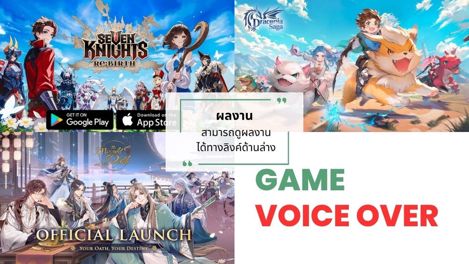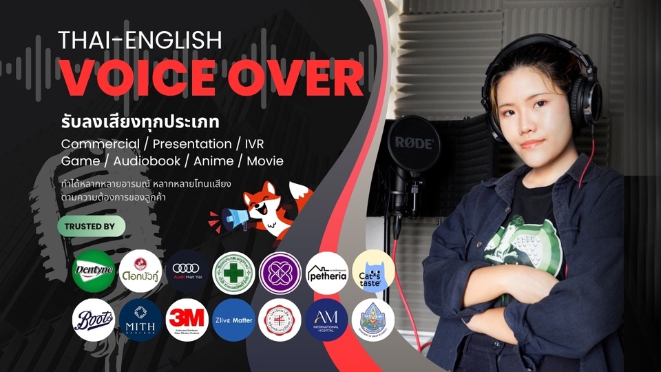 รับลงเสียงทุกประเภททั้งภาษาไทยและภาษาอังกฤษ เช่น สปอตโฆษณา เสียงตอบรับอัตโนมัติ พรีเซนเทชั่น หนังสือเสียง ภาพยนตร์ อนิเมชั่น เกม เป็นต้น สามารถทำได้หลากหลายโทนเสียงตามความต้องการของลูกค้า ส่งงานเป็นไฟล์ .wav หรือ .mp3 ตัดเสียงรบกวนให้เรียบร้อย ตัวอย่างเสียงและผลงานสามารถดูได้ที่ลิงค์ด้านล่างนี้ค่ะ [ผลงาน TH/EN] https://drive.google.com/drive/u/0/folders/1nek55yEx1FbZVdYI1Gp4k5SJXO98sDhq [Presentation TH/EN] https://drive.google.com/drive/folders/1l-T_VxwRHgn2FibYCcKfjh6qvHYpBURa?usp=drive_link [ตัวอย่างเสียง Thai] https://drive.google.com/drive/folders/195luR8_jjN10NmLIXeBTOu9_NGXRY1um?usp=drive_link [ตัวอย่างเสียง English] https://drive.google.com/drive/folders/18fBEN2faOCQvYuwYF710jJ3iSQUG9enG?usp=drive_link [IVR เสียงตอบรับอัตโนมัติ TH/EN] https://drive.google.com/drive/folders/1RM4tTsCkWfwLsnn0v3Hgh01ec_7EiQQE?usp=drive_link [DEMO หนัง/อนิเมชัน] https://drive.google.com/drive/folders/1kbI2A0k4Olxr6_4q6WgpFqtLJ5DvUNp5?usp=drive_link ขั้นตอนการทำงาน 1. แจ้งรายละเอียดที่ต้องการ (เช่น Mood & Tone) 2. ส่งScriptเพื่อให้ทางเราประเมินราคา 3. สร้างใบเสนอราคา และชำระเงินตามขั้นตอน 4. เริ่มทำการบันทึกเสียง 5. ส่งไฟล์งานให้ลูกค้าฟังว่าต้องการปรับแก้ตรงไหน (แก้ได้ไม่เกิน3ครั้ง) 6. ลูกค้าคอนเฟิร์มว่าไฟนอลแล้วจึงปิดงาน