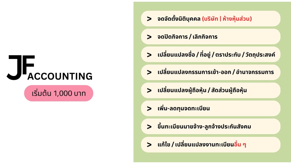 - จดจัดตั้งนิติบุคคล (บริษัท | ห้างหุ้นส่วน) - จด Vat (ภาษีมูลค่าเพิ่ม) - ขึ้นทะเบียนนายจ้าง-ลูกจ้าง - จดหยุดกิจการชั่วคราว (ประกันสังคม) - จดปิดกิจการ / เลิกบริษัท (กรมพัฒน์ ฯ | กรมสรรพากร | ประกันสังคม) - ให้คำปรึกษา / วางแผน แนวทางการดำเนินการและแก้ไข ขั้นตอนการทำงาน 1. ลูกค้าแจ้งความประสงค์ในเรื่องที่ต้องการ 2. สอบถามรายละเอียดธุรกิจและข้อมูลอื่น ๆ ที่เกี่ยวข้อง เพื่อประเมินเบื้องต้น 3. ให้คำปรึกษา รวมถึงแจ้งข้อดี-ข้อเสีย ก่อนดำเนินการในเรื่องต่าง ๆ 4. หลังจากตกลงรับบริการ จะแจ้งเอกสารเบื้องต้นที่ต้องจัดเตรียม 5. ตรวจสอบความถูกต้องและครบถ้วนของเอกสารที่ได้รับ 6. ดำเนินการตามขอบเขตที่ได้รับ 7. แจ้งความคืบหน้าของการดำเนินการให้ลูกค้าทราบ 8. หลังจากดำเนินการเสร็จสิ้น จะส่งเอกสารจดจัดตั้งบริษัทให้ลูกค้าตรวจสอบและแก้ไข
