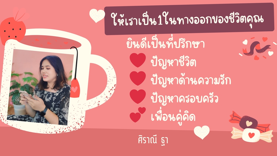 จบการศึกษารัฐศาสตรมหาบัณฑิต ปัจจุบันเป็นอาจารย์มหาวิทยาลัยและรับปรึกษาปัญหาชีวิต ด้านความรักครอบครัวปัญหาขีวิตคู่ทุกเพศทุกวัย ยินดีรับฟังเป็นเพื่อนปรับทุกข์และร่วมแก้ปัญหาไปกับทุกคนบนพื้นฐานความเป็นจริงค่ะ ขั้นตอนการทำงาน 1. แจ้งเรื่องที่อยากคุยหรือต้องการให้เราช่วยรับฟังแก้ไข(เป็นการโทรผ่านช่องทางโซเชียลมีเดียที่คุณลูกค้าสะดวก 2. ระบุวันที่ เวลาที่คุณลูกค้าต้องการ 3. ชำระเงิน 4. รับบริการ 5. ให้คะแนน-รีวิว