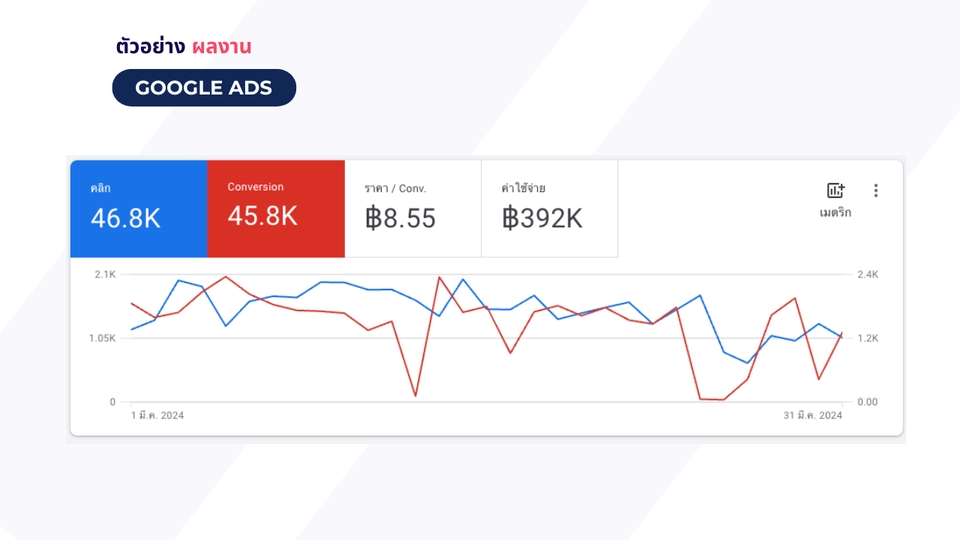 บริการทำโฆษณาออนไลน์ บน Google Ads โปรโมท ผลิตภัณฑ์บน Google ผ่านทางเว็บไซต์ เพื่อเพิ่มยอดขายให้กับธุรกิจโดยทีมงานผู้เชี่ยวชาญ ✓ Advertising Consult เรามีทีมผู้เชี่ยวชาญที่พร้อมให้คำแนะนำ เกี่ยวกับการทำโฆษณา พร้อมทั้งกำหนดลักษณะของโฆษณาให้เหมาะสมกับความต้องการ ✓ Website Development เรามีทีมนักพัฒนาเว็บไซต์ที่จะคอยช่วยปรับหน้าตาและระบบ ให้เหมาะสมก่อนที่จะทำโฆษณา ทำให้ได้ประสิทธิภาพสูงสุด ✓ Follow Ads Optimization เราติดตามวัดผลลัพธ์ของการทำงานทุกแคมเปญโฆษณา พร้อมทั้ง ปรับปรุงประสิทธิภาพให้ดีมากยิ่งขึ้น ✓ Monthly Report หลังจากที่ทำโฆษณาครบทุกเดือนเราจะมีการรายงานผลลัพธ์ของ การทำงานและประสิทธิภาพของผลลัพธ์ให้กับลูกค้า ขั้นตอนการทำงาน 1. Online Meeting กับลูกค้าเพื่อสอบถามข้อมูล 2. ลูกค้าชำระค่าบริการผ่านระบบ Fastwork 3. ทีมงานวางแผนกลยุทธ์ในการทำโฆษณา 4. ทีมงานทำการ Optimize Ads ทุก 3-5 วันเพื่อปรับ Keyword ให้เหมาะสม 5. จัดทำรายงานสรุปผลการทำงานรายเดือนให้กับลูกค้า