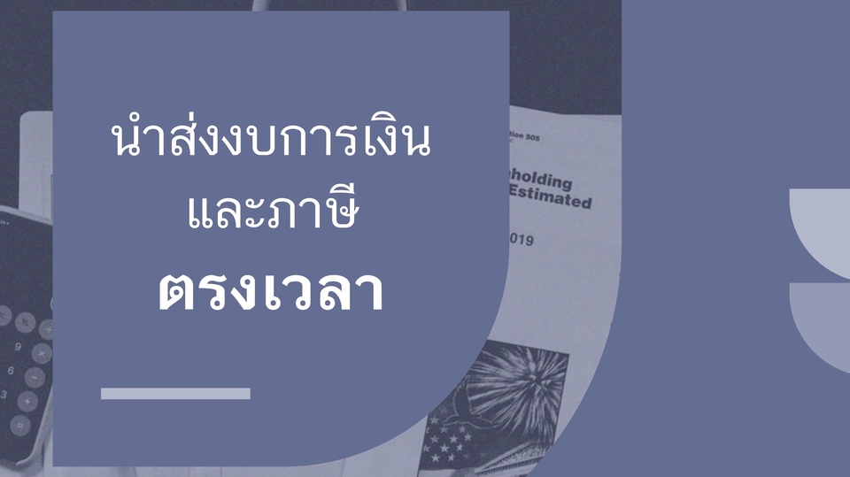 ฿5,000- ฟอร์มการยื่นภาษี - เอกสารการคำนวณภาษี (สามารถปรับลดเพิ่ม ขึ้นอยู่กับความซับซ้อนของภาษีที่เกี่ยวข้อง)