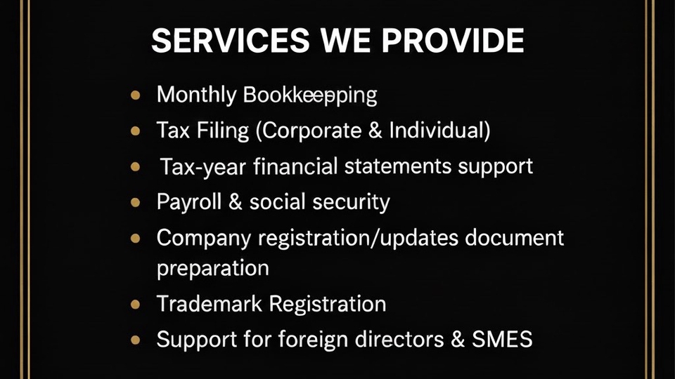 Hi! We are TP Accounting - certified accountants with over 10 years of experience in monthly bookkeeping, tax filing, payroll, and compliance for SMEs and foreign-owned companies in Thailand. We focus on delivering accurate work, clear communication, and fast response so you always know what’s going on with your accounts. We're easy to talk to, detail-oriented, and committed to making accounting simple and stress-free for you. Whether you need full monthly service or help with specific filings, We are here to support you with reliable and professional care. 💼 Services We Provide - Monthly bookkeeping (Xero, PeakAccount, Flowaccount) - VAT filing (PP30, PP36) - Withholding tax (PND1, PND3, PND53, PND54) - Year-end financial statements support - Payroll & social security - Company registration/updates document preparation - Trademark Registration - Personal tax / PND90–91 - Support for foreign directors & SMEs ✨ Why work with us? - Clear explanations (Thai + English) - Fast response, friendly communication - Strong experience with SMEs & foreign companies - Accurate and reliable work - Flexible pricing based on your business size 📌 Let us handle your accounting so you can focus on growing your business. ⭐ Feel free to message us. We are happy to discuss what you need.