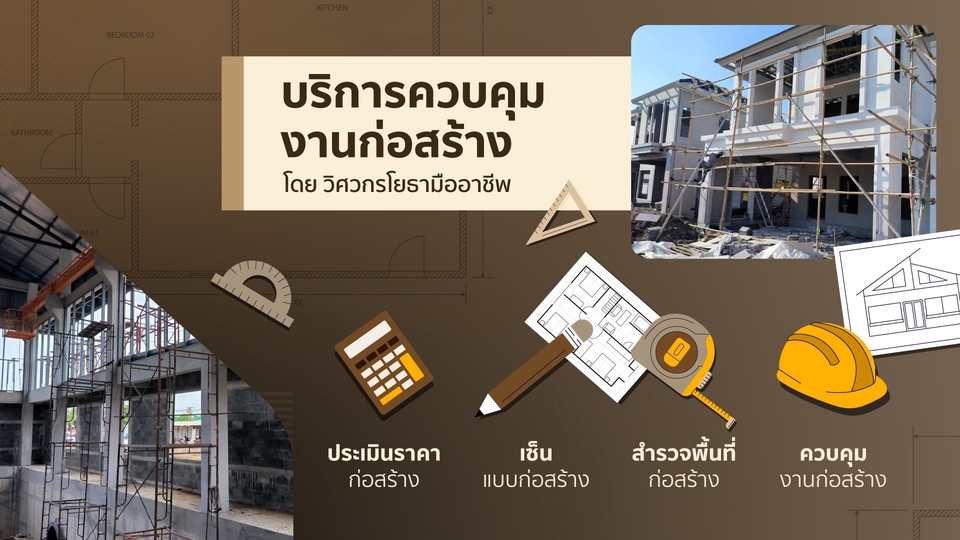 ให้คำแนะนำให้เรื่องงานก่อสร้างบ้าน โรงงาน อาคาร / รับตรวจและควบคุมงานก่อสร้างให้เป็นไปตามแบบที่กำหนด มีใบประกอบวิชาชีพ (กว.) สามารถเดินทางได้ทั่วประเทศ ขั้นตอนการทำงาน 1. พูดคุย แนะนำ เป้าหมาย แผนงาน ในการว่าจ้าง เพื่อให้ลูกค้าสามารถตัดสินใจก่อนว่าจ้าง 2. ดำเนินงานตามที่ได้ตกลงกัน
