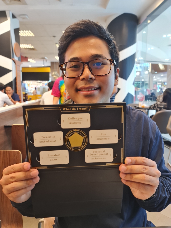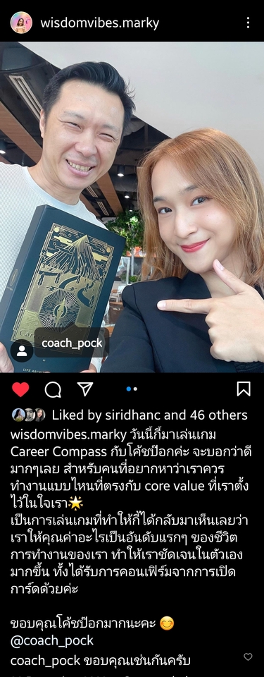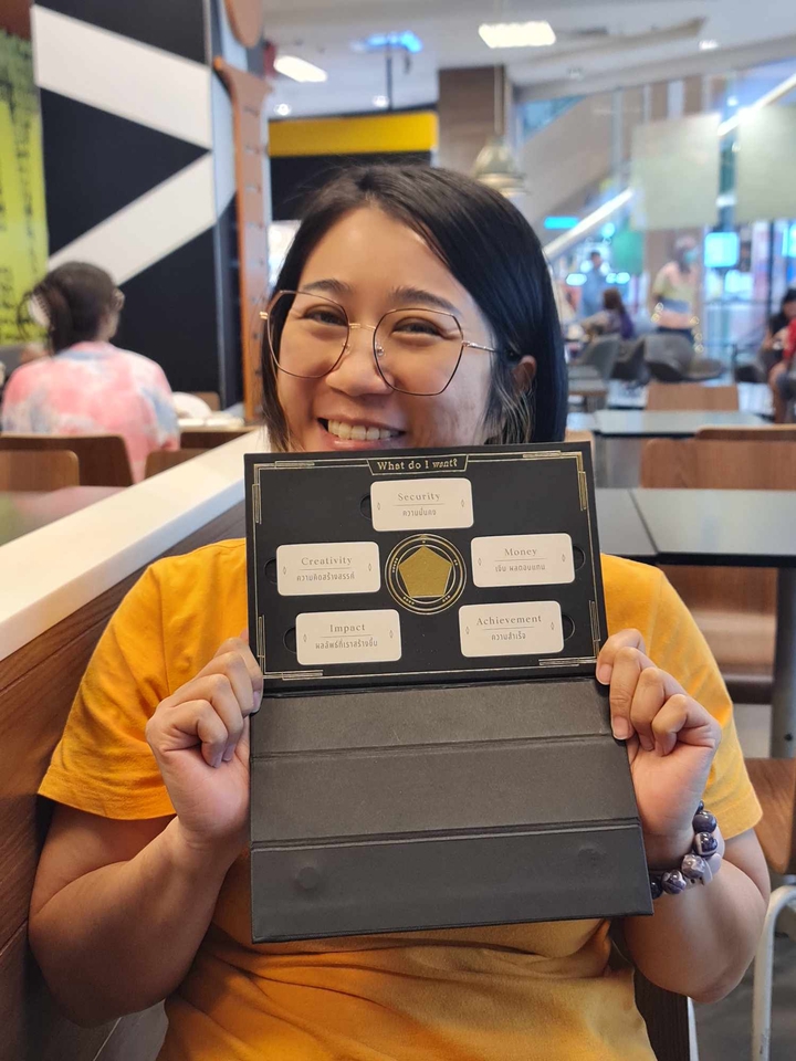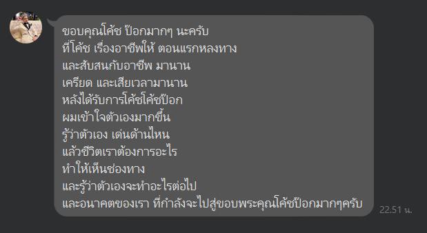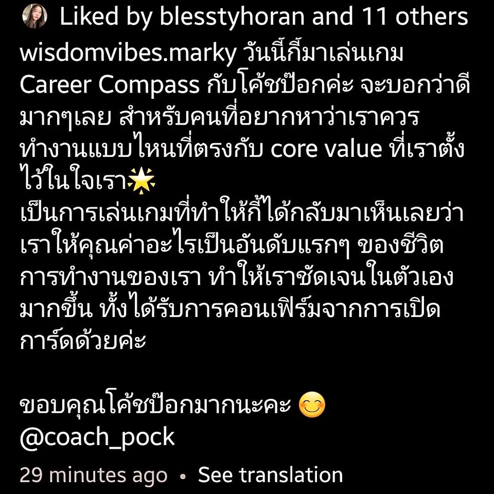 ทำไมต้องใช้บริการผม - เป็นเครื่อมือที่ถูกคิดค้นจาก ผู้บริหารด้านบริหารกลยุทธ์ทางธุรกิจ ท่านหนึ่ง - การโค้ชเชื่อถือได้ เพราะผมเรียนรู้การใช้เครื่องมือจนชำนาญ - ไว้ใจได้เพราะผมจบการโค้ชด้วยเครื่องมือจากสถาบันที่น่าเชื่อถือ - แน่ใจได้เพราะประสบการณ์มากกว่า 5 ปี เฉพาะด้านการโค้ชด้านศักยภาพมนุษย์ - สบายใจได้ว่าจะไม่ถูกทิ้งหลังการโค้ช เพราะผมมีบริการติดตามการเปลี่ยนแปลง หลังการโค้ช (มีค่าบริการเพิ่ม) - สงสัยสามารถถามได้ เพราะความชัดเจนในการโค้ช คุณจะเห็นหนทางที่ชัดเจน วิธีการโค้ชด้วย Career Compass หรือ Career Canavas Boxset - โค้ชตัวต่อตัว สถานที่ไม่เสียงดัง working space หรือร้านกาแฟ ที่ไม่วุ่นวาย - ใช้เวลา 1.30 - 2.00 ชั่วโมง - การโค้ชจะผ่าน เครื่องมือ Career Compass หรือ Career Canva - มีการใช้ไพ่ ในการนำทาง - หากโค้ชด้วย Career Canvas จะมีสมุดบันทึกกลยุทธ์ เพื่อระบุ Action plan อย่างละเอียด ขั้นตอนการทำงาน 1. คุยเบื้องต้นเพื่อหา เป้าหมายในการโค้ช 2. นัดเพื่อพบในสถานที่ เหมาะกับการโค้ช 3. หาตำแหน่งสภาวะของคุณ อยู่ตรงไหนในอาชีพ ด้วย Graph of career 4. บรรยายด้วยภาพในสภาวะปัจจุบัน + โค้ชถามด้วยคำถามเฉพาะเพื่อเจาะหาสาเหตุปัจจุบัน 5. โค้ชเพื่อหา สิ่งที่คุณต้องการจริงๆ ในอาชีพนี้ คืออะไรอย่างชัดเจน 6. เรียงคำที่มีคุณค่าสำหรับคุณ ที่ได้จากการโค้ช 7. ใช้เหรียญแห่งงาน เพื่อตรวจสอบตำแหน่งสภาวะงานปัจจุบัน มี 4 โซน แต่ละโซนจะต้องหยิบไพ่ที่แตกต่างกัน 8. ระบุสภาวะงานปัจจุบัน 9. หยิบไพ่ เพื่อนำไปสู่ช่วงสุดท้าย 10. สร้างภาพใน version ที่ดีที่สุดของเรา และระบุรายละเอียดความแตกต่างกับปัจจุบัน จากนั้นสรุปผล