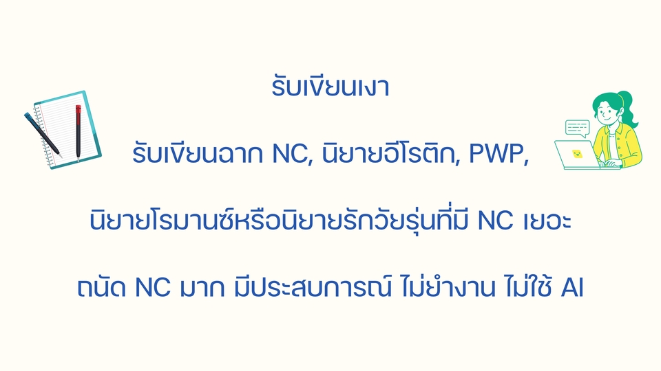 รับเขียน NC / PWP ค่าจ้าง 200฿/1,000 คำ รับเขียนขั้นต่ำ 2,000 คำ ต่ำกว่านี้ไม่รับค่ะ รายละเอียดการจ้างงาน • คุณต้องมีพล็อตและทรีทเมนต์มาเอง • แก้ได้ 1 ครั้งค่ะ ดังนั้นรบกวนอ่านแล้วติทีเดียวนะคะ แนวที่ไม่รับ • พีเรียด • จีนโบราณ • โอเมก้าเวิร์ส • การมีเพศสัมพันธ์ของเอเลียนหรือมนุษย์ต่างดาว • การมีเพศสัมพันธ์กับสัตว์หรือเลียนแบบสัตว์หรือถูกกระทำอย่างสัตว์ • รสนิยมที่พิสดารเกินไป • ซาดิสต์/โรคจิต/วิปริต/เปโด • เสพยาเสพติด/เมายาเสพติด • สายเลือดเดียวกัน • แนวราชนิกุลที่ต้องใช้คำราชาศัพท์ - เขียนได้ทั้ง ชญ , ชช , ญญ , 3-5 P (แต่หลายพีราคาจะสูงกว่านะคะ) - ขอความกรุณาบรีฟให้ละเอียด ยิ่งละเอียดมากยิ่งดีต่อตัวคุณเองค่ะ เราจะได้เข้าใจความต้องการของคุณและทำงานให้ใกล้เคียงกับที่คุณต้องการที่สุด หากไม่บรีฟหรือเราถามแล้วคุณตอบสั้น ๆ จะทำให้เริ่มงานช้าหรือต้องแก้หลายรอบค่ะ เราไม่มีปัญหาเรื่องการแก้งานหลายรอบและไม่คิดเงินเพิ่มค่ะ แต่เราก็อยากให้คุณได้งานที่ถูกใจเร็วที่สุดมากกว่านะคะ 😊 - ไม่รับงานเร่งค่ะ เราเขียนเองไม่ได้ใช้ AI จึงไม่สามารถประมวลผลได้รวดเร็วเหมือนโปรแกรม และสภาพร่างกายเราก็ถดถอยได้ตามการใช้งาน ไม่สามารถทำงานได้ทั้งวันทั้งคืนโดยไม่เหนื่อยค่ะ - ถนัดหยาบ ๆ พระเอกแซ่บ เผ็ด ดุ นางเอกแรด ร่าน ใจกล้า ถนัด Dirty Talk - งานทุกงานที่คุณจ้าง จะเป็นลิขสิทธิ์ของคุณ 100% เราจะไม่มีการนำไปเผยแพร่หรือบอกใครเด็ดขาด เราไม่เคยถามด้วยซ้ำว่าลูกค้านามปากกาอะไรหรือนิยายชื่ออะไร เพราะเราถือว่ามันไม่ใช่ผลงานของเรา จึงไม่มีความจำเป็นต้องรู้ ดังนั้นข้อมูลไม่รั่วไหลจากเราแน่นอนค่ะ - เราจะไม่เอาพล็อตของคุณไปเขียนเองหรือขายให้คนอื่นเด็ดขาด - เราเขียน PWP มานานแล้วค่ะ มีตัวตน ไม่ใช่มิจ มีนามปากกาในรอร. แต่ไม่ค่อยได้กลับไปเขียนของตัวเองเนื่องจากงานเขียนเงามีลูกค้าเรื่อย ๆ ฉะนั้นลูกค้าสบายใจได้นะคะว่าเราจะไม่ดองงานคุณไปเขียนงานตัวเองหรือแอบรับงานซ้อน เพราะเราไม่เก่งพอจะทำหลายงานพร้อมกัน สุขภาพร่างกายเราก็ไม่ได้ดีพอจะปั่นงานเยอะ ๆ ในเวลาเดียวกันหรอกค่ะ *ถ้าเป็นพล็อตอ่อนไหว เช่น การวางยานางเอก การคุกคามทางเพศ สตอล์กเกอร์ บังคับขืนใจ บังคับค้าประเวณี ผิดศีลธรรม นอกกายนอกใจ รบกวนแจ้งก่อนนะคะ เราเขียนได้ถ้าเน้นแค่ NC แบบที่ตัวละครมีอารมณ์ร่วม แต่ถ้าให้เขียนเนื้อเรื่องโดยพยายามฟอกขาวให้เป็นเรื่องปกติหรือดูโรแมนติกหรือตัวละครไม่เต็มใจ ไม่มีความสุข เราขออนุญาตไม่รับค่ะ ขั้นตอนการทำงาน 1. สามารถทักมาสอบถามคิวว่างได้ค่ะ รบกวนไม่กด