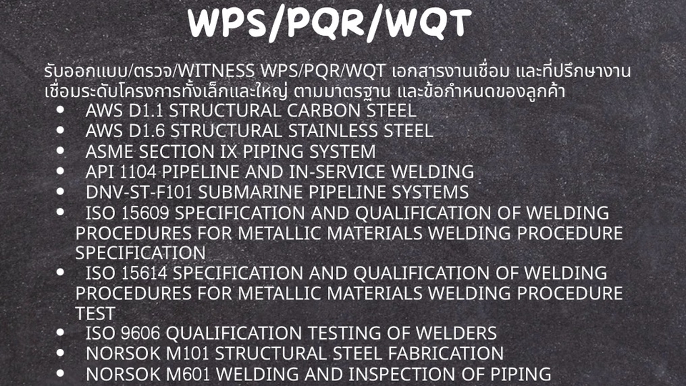 รับออกแบบ/ตรวจ/Witness WPS/PQR/WQT เอกสารงานเชื่อม สอบช่างเชื่อมพร้อมใบรับรอง (Welder cert.) โดยวิศวกรงานเชื่อม certified CSWIP 3.1 ระดับสากล และที่ปรึกษางานเชื่อมระดับโครงการทั้งเล็กและใหญ่ ตามมาตรฐานสากลและข้อกำหนดของลูกค้า (AWS D1.1/ASME IX/API1104/DNV-ST-F101/ISO15614/ISO15609/ISO9606