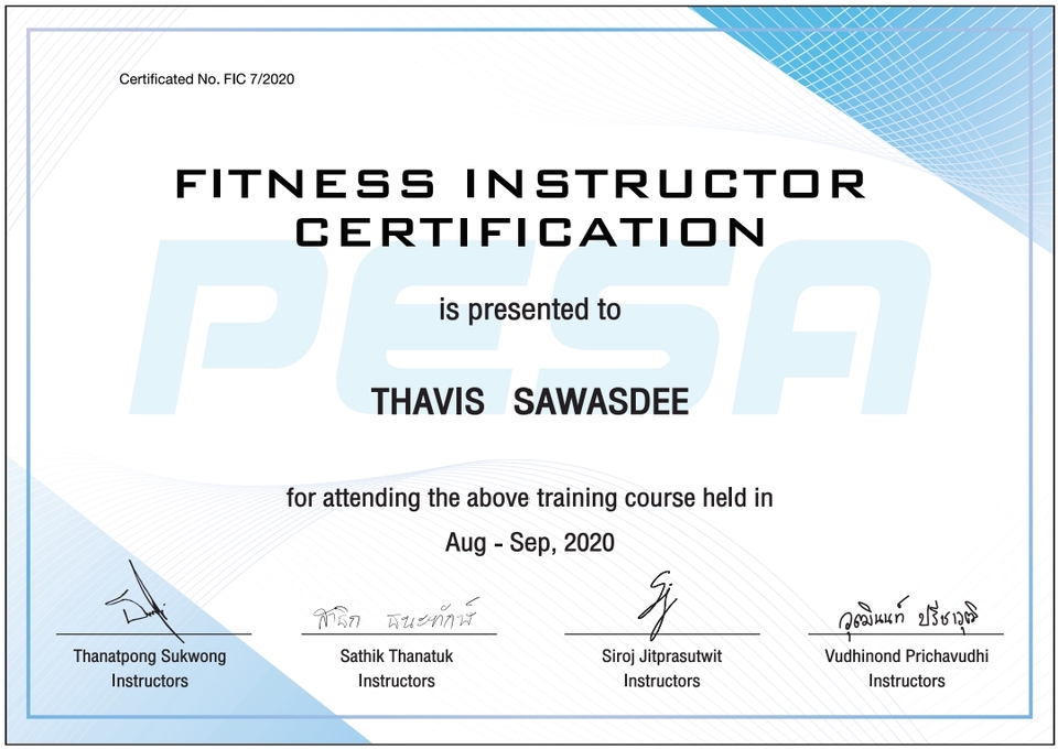 THAVIS (F) ปัจจุบันอาชีพ Personal Trainer วางแผน แนะนำ และให้คำปรึกษาการดูแลสุขภาพและไลฟ์สไตล์ ประสบการณ์ 5 ปี Certification - Cerftfied Personal Trainer - International Sports Sciences Association (ISSA) - Physical Education of Bachelor's Degree - Srinakharinwirot University - Fitness Instructor Certificate - PESA(TH)