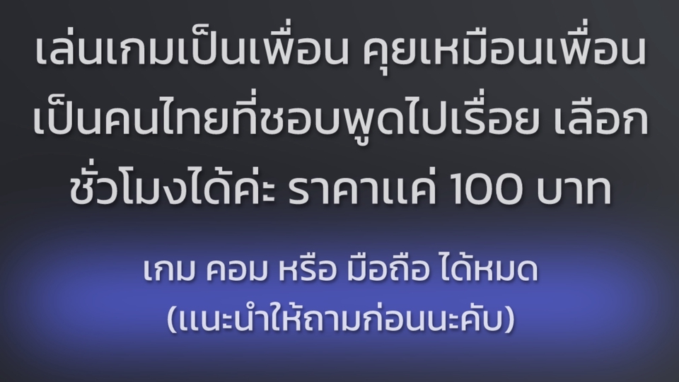 เล่นเกมเป็นเพื่อน คุยเหมือนเพื่อน เป็นคนไทยที่ชอบพูดไปเรื่อย เลือกชั่วโมงได้ค่ะ ราคาเเค่ 100 บาท เล่นเกมคอมหรือ มือถือ ก็ได้หมด