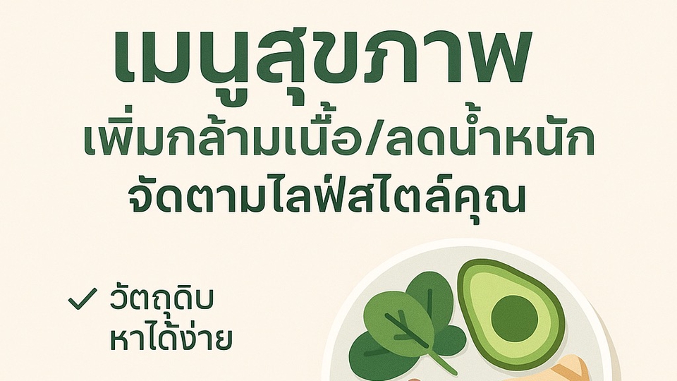 อยากกินดีขึ้นแต่ไม่รู้จะเริ่มยังไง? ฉันจะช่วยออกแบบ “เมนูสุขภาพที่เข้ากับชีวิตคุณจริง ๆ” เน้น เพิ่มกล้ามเนื้อ, ลดไขมัน หรือดูแลสุขภาพแบบยั่งยืน โดยใช้วัตถุดิบที่หาได้ง่ายและทำตามได้ทุกวัน คุณจะได้อะไรจากบริการนี้: • เมนูจัดตามเป้าหมายและตารางชีวิต • ข้อมูลแคลอรีและสารอาหารครบถ้วน • Tips เตรียมวัตถุดิบและเทคนิคกินง่าย ๆ ไม่ยุ่งยาก • เหมาะสำหรับทั้งคนที่ทำอาหารเองและคนที่สั่งอาหารเดลิเวอรี แพ็กเกจของฉัน: • Basic (500 บาท): เมนู 3 วัน (เช้า–กลางวัน–เย็น) พร้อมคำแนะนำสารอาหาร • Standard (900 บาท): เมนู 7 วัน + Tips เตรียมวัตถุดิบล่วงหน้า • Premium (1,500 บาท): เมนู 14 วัน + ตารางเวลาการกิน + Q&A ปรึกษา 1 ครั้ง สิ่งที่ฉันต้องการจากคุณ: 1. เป้าหมาย (เพิ่มกล้ามเนื้อ / ลดไขมัน / คุมสุขภาพ) 2. น้ำหนัก ส่วนสูง อายุ และเวลาที่สะดวกกินมื้อหลัก 3. อาหารที่ชอบ ไม่ชอบ หรือแพ้ 4. อุปกรณ์ทำอาหารที่มี และข้อจำกัดด้านเวลา