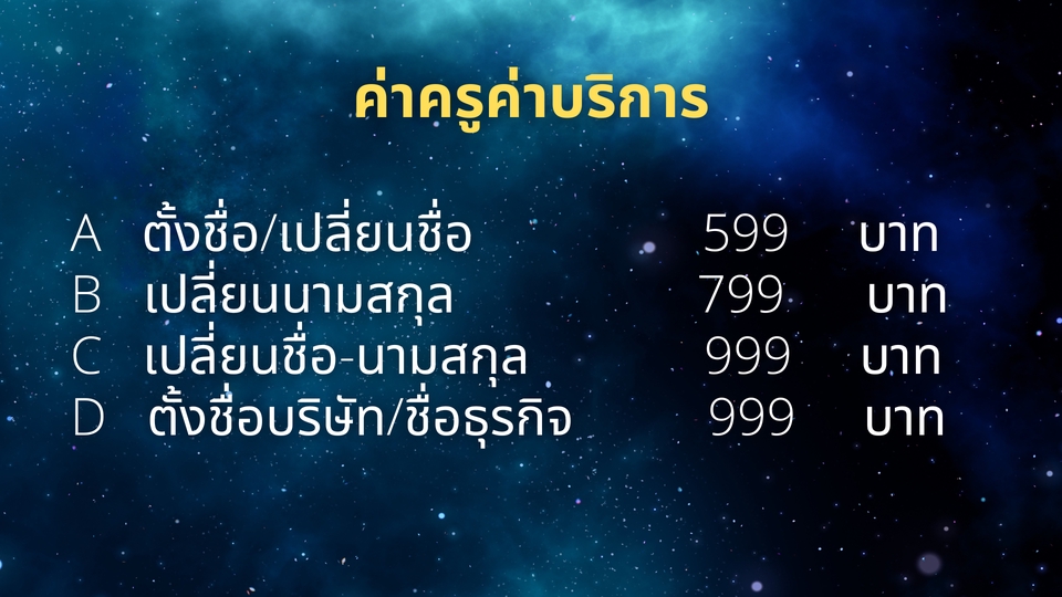 รับตั้งชื่อ เปลี่ยนชื่อ เปลี่ยนนามสกุลใหม่ ตั้งชื่อบริษัท ตั้งชื่อธุรกิจ ตามหลักเลขศาสตร์ เสริมพลังด้านการงาน การเงิน สุขภาพ และความรักความสัมพันธ์ เสริมสิริมงคลให้ชีวิต โดยผู้มีประสบการณ์มากกว่า 15 ปี ขันตอนการทำงาน 1. แจ้งชื่อ-นามสกุลปัจจุบัน และวัน เดือน ปีเกิด 2. แจ้งรายละเอียดความต้องการเพื่อวิเคราะห์ 3. แจ้งแพ็กเกจที่ต้องการ 4. ชำระค่าครูค่าบริการ 5. เริ่มทำงาน 6. ส่งงานภายใน 2-3 วัน หลังจากชำระค่าครูแล้ว สามารถปรึกษา และสอบถามเพิ่มเติม ได้ 30 วัน หลังจากส่งงานแล้ว