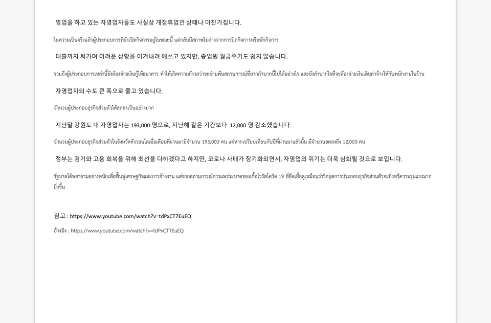 รับแปล ภาษาเกาหลี-ไทย บทความ, คู่มือสินค้า, เครื่องสำอาง, สกินแคร์, ศัลยกรรม, โรงแรม, สถานที่ท่องเที่ยว, ประวัติศาสตร์, สคริปต์, ข้อมูลผลิตภัณฑ์ และอื่นๆ มีประสบการณ์ทำงาน ล่าม,แปล เอกสารต่างๆ ภายในองค์กรมากกว่า 2 ปี ขั้นตอนการทำงาน 1. คุยรายละเอียดของงานแปลและประเมินราคา 2. ส่งงานฉบับแปลให้ลูกค้า 3. ลูกค้าตรวจสอบงานแปล 4. สรุปจบงาน