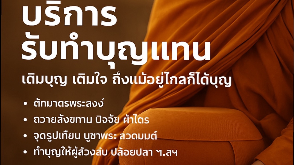ติดต่อเราเพื่อเติมบุญให้เต็มใจ หากคุณกำลังมองหาวิธีทำบุญที่ทั้งสะดวก สบาย และสบายใจ เราคือทีมงานที่พร้อมเป็น “ผู้แทนบุญ” ให้กับคุณในทุกช่วงชีวิต เพราะบุญไม่ได้ขึ้นอยู่กับสถานที่ แต่ขึ้นอยู่กับ “ใจที่ตั้งมั่น” แค่ทักมา แล้วบอกว่าอยากทำบุญแบบไหน — ที่เหลือเราจัดให้ครบ “ถึงแม้อยู่ไกล… ใจก็ถึงบุญได้เสมอ” บริการรับทำบุญแทน – อุ่นใจ เหมือนได้ทำเอง ขั้นตอนการทำงาน 1. คุยรายละเอียดงาน 2. ทำงาน 3. เสร็จสิ้น