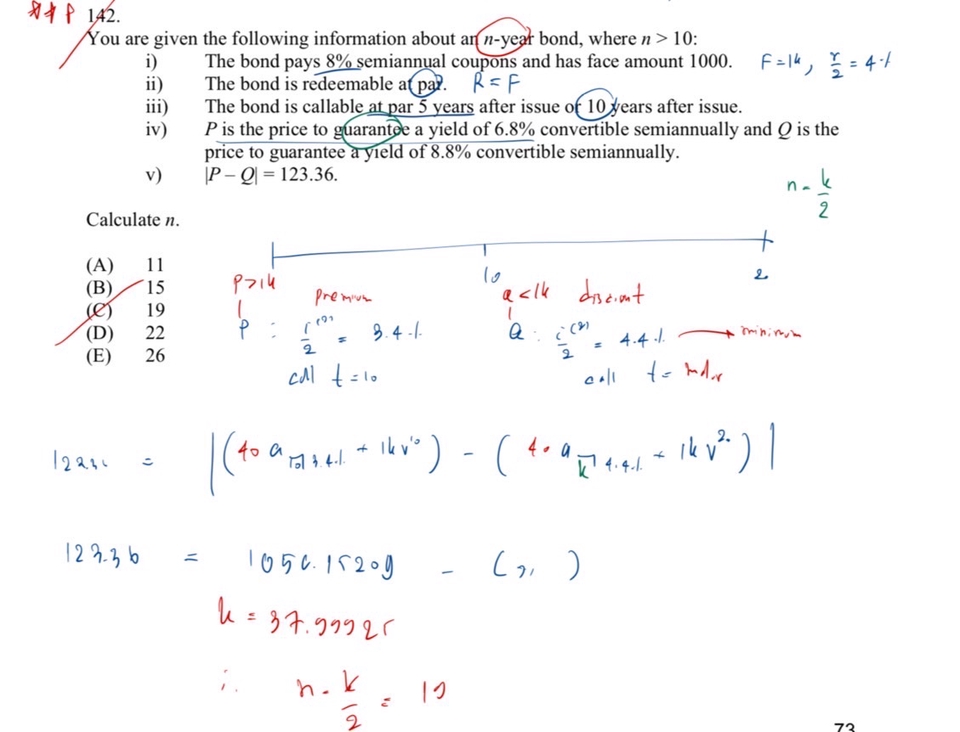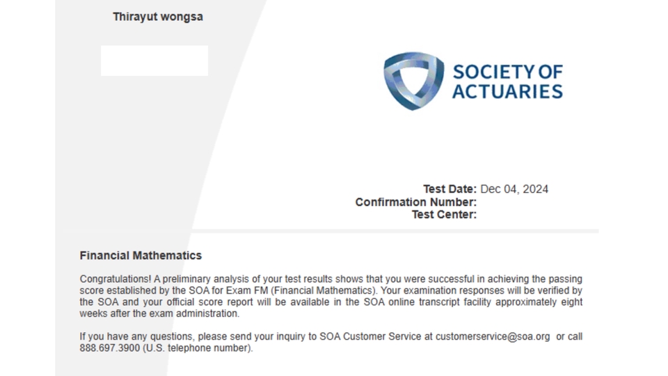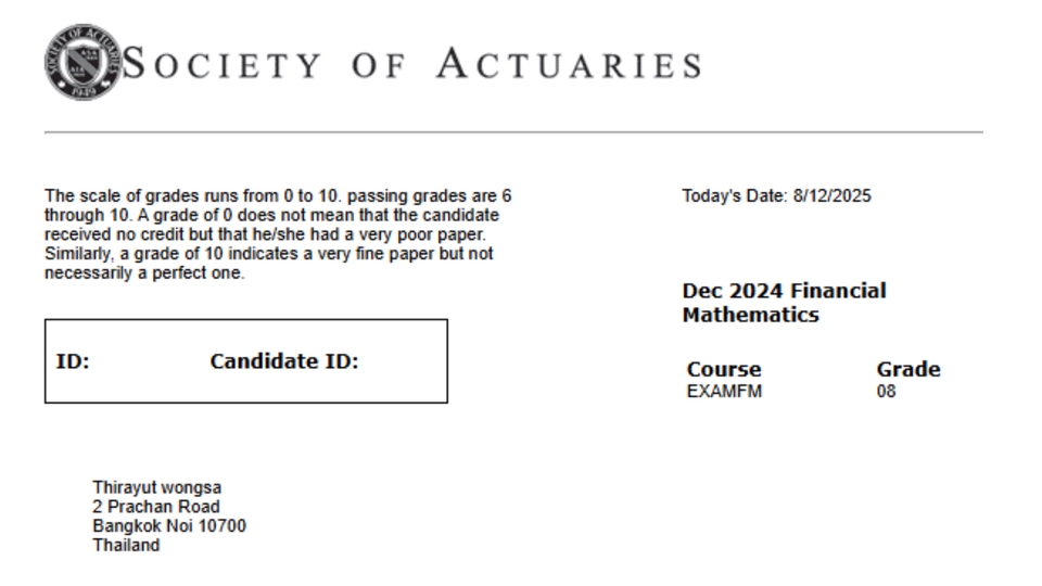 สวัสดีครับ ผมได้ Grade EXAM FM 8/10 ผมรับสอน EXAM FM เพื่อสอบของ SOA โดยเฉพาะครับ รวมถึงการใช้เครื่องคิดเลข คณิตศาสตร์การเงิน ( Texas Instruments BA-35 , Texas Instruments BA II Plus ) แล้วก็จะมีสอนทำโจทย์สามารถดูโจทย์แบบแสดงวิธีทำให่ดูใน Sample exam ของทาง SOA ทวนได้ตลอดครับระยะเวลา 1 ปีเต็ม การสอนจะมีทั้งหมดประมาณ 10 - 14 ครั้ง ครั้งละ 3 ชม. และสามารถทักมาถามข้อที่สงสัยได้ตลอดเวลาครับ เนื้อหาจะมีดังนี้ครับ 1. Interest Theory 1.1 Basic Concepts of Interest Simple Interest vs. Compound Interest Accumulation Function & Discount Function Comparing different interest growth methods 1.2 Interest and Discount Rates Effective Rate of Interest & Discount Nominal Rate of Interest & Discount Force of Interest (δ) and its relationship with i andd Time value of money relationships 1.3 Conversions Between Rates Converting nominal to effective rates Converting between different compounding periods Continuous compounding 2. Annuities 2.1 Level Annuities Annuity-Immediate and Annuity-Due Present Value (PV) and Future Value (FV) formulas Deferred Annuities 2.2 Non-Level Annuities Increasing Annuities (arithmetically increasing) Decreasing Annuities Geometrically Increasing Annuities 2.3 Special Annuities Perpetuities (perpetual annuities) Changing payment frequency Applications in financial problem solving 3. Loans 3.1 Loan Calculations Level Payment Loans Balloon Payment Loans 3.2 Amortization Schedules Interest and principal portions per payment Outstanding Balance – prospective and retrospective methods 3.3 Sinking Funds Concept and calculation formulas Comparison of sinking funds vs. amortization 4. Bonds 4.1 Bond Characteristics Face Value, Coupon Rate, Redemption Value Price, Yield Rate, Accrued Interest 4.2 Pricing and Yield Calculations Price formulas for premium and discount bonds Yield to Maturity (YTM) Callable Bonds 4.3 Advanced Bond Analysis Duration: Macaulay Duration and Modified Duration Convexity and risk sensitivity analysis 5. General Cash Flows & Portfolios 5.1 Cash Flow Analysis Present Value and Net Present Value (NPV) Internal Rate of Return (IRR) Comparing multiple investment projects 5.2 Portfolio Analysis Portfolio Yield Weighted Average Rate of Return Diversification principles in investment portfolios 6. Immunization & Risk Management 6.1 Basic Immunization Purpose and concept of immunization Redington Immunization Conditions 6.2 Advanced Immunization Full Immunization strategy Using duration and convexity together 7. Exam Strategies Time management techniques Elimination strategies for multiple-choice questions Efficient use of BA II Plus / HP 12C financial calculators Practice with past exams and mock tests