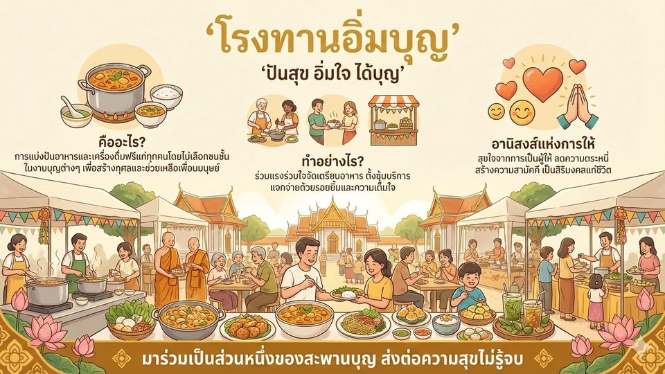 1.จัดทำอาหารโรงทานทั้งอาหารคาวหวาน เดินทางออกนอกสถานที่ไปยังจุดหมายปลาทาง พื้นที่กรุงเทพฯและปริมณฑล 2.อาหารอร่อย ปริมาณเหมาะสม รับรองเรื่องของคุณภาพ ความสะอาด และปริมาณ คุ้มค่าแน่นอน 3.เหมาะสำหรับใครที่ไม่สะดวกทำอาหารเองหรือทำอาหารไม่ค่อยเป็น แต่อยากได้บุญจากการทำโรงทานแนะนำเลยนะ ไม่ผิดหวังแน่นอน ขั้นตอนการทำงาน 1. คุยรายละเอียดกับลูกค้า สถานที่ทำโรงทานอยู่ที่ใด ต้องการอาหารรสชาติแบบไหน วันเวลาที่จะทำโรงทาน 2. สำรวจสถานที่จริง 3. จัดเตรียมวัตถุดิบ อุปกรณ์ทำครัว ก่อนวันทำโรงทาน 1-2 วัน 4. ออกเดินทางไปหน้างานเพื่อจัดเตรียมสถานที่และเริ่มทำอาหารตามออเดอร์ลูกค้า โดยจะไปถึงสถานที่ก่อนเวลาแจกทาน 2-3 ชม.