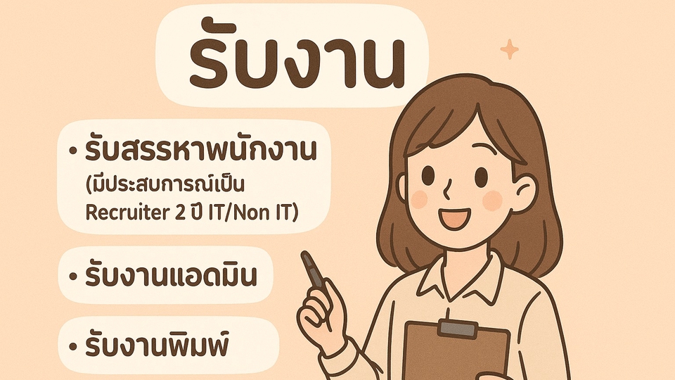✨ มีประสบการณ์รีครูท IT/Non-IT 2 ปี ✨ ดูแล Line OA มากกว่า 5 ปี ✨ ใช้ Word / Excel / PowerPoint / Canva คล่อง ✨ รับงานแอดมิน พิมพ์งาน เอกสาร ตอบแชท ✨ ว่างงานหลังเลิกงานและวันหยุด พร้อมส่งงานตรงเวลา