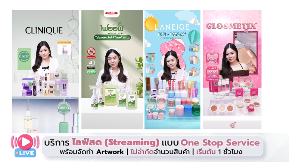 📍 รับงาน Live ไลฟ์สด/ online streaming/ รีวิวสินค้า บนทุก platform ✅ Platform ที่สามารถ LIVE ได้ เช่น Shopee/ TikTok/ Lazada/ Facebook/ Instagram ✅ สามารถไลฟ์พร้อมกัน 2ช่องทางได้ ✅ สามารถไลฟ์ผ่านระบบ OBS/ TikTok LIVE Studio ได้ ✅ Green Screen ✅ Screen mirroring แสดงหน้าจอโทรศัพท์ขึ้นไลฟ์ 📲 เพื่อสาธิตวิธีการซื้อสินค้า หรืออื่นๆ ได้ ✅ ให้ความสำคัญกับ CI ของแบรนด์ ✅ จัดทำ Artwork/ Graphic/ Motion Graphic สำหรับไลฟ์ 👗 Costume จัดเต็ม เลือกสีตรงตาม CI ของแบรนด์/ หลากหลายสไตล์ตรงตาม Concept ที่แบรนด์ต้องการ 📝 Report หลังจบไลฟ์ 📌 หากแบรนด์/ สินค้าไม่สะดวกส่งสินค้าจริง สามารถนำภาพสินค้าทำกราฟฟิค ขึ้นแสดงในไลฟ์ให้ได้นะคะ ขั้นตอนการทำงาน 1. ลูกค้าแจ้งรายละเอียดของงานที่ต้องการว่าจ้างเบื้องต้น เช่น ชื่อแบรนด์ สินค้า วัน เวลา และจำนวนชั่วโมงที่ต้องการ รวมทั้งความต้องการพิเศษ (หากมี) 2. จัดทำใบเสนอราคาผ่านระบบให้ลูกค้าพิจารณา 3. หากลูกค้ายืนยันว่าจ้างแล้ว จัดส่งแบบฟอร์ม เพื่อให้ลูกค้ากรอกบรีฟของงานอย่างละเอียด หรือในกรณีลูกค้ามีบรีฟอยู่แล้วสามารถส่งมาได้ 4. ลูกค้าจัดส่งสินค้าที่ต้องการให้โชว์ภายในไลฟ์ หรือหากไม่สะดวกจัดส่งจะทำเป็นภาพกราฟฟิคแทนให้