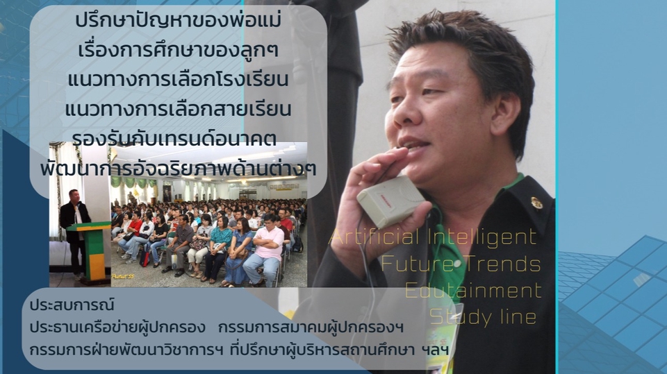 ให้คำแนะนำเกี่ยวกับแนวทางการศึกษา การพัฒนาศักยภาพของลูกคุณ ด้วยประสบการณ์ ให้คำปรึกษา และบริหาร ในการเป็น ปธ เครือข่ายผู้ปกครอง กก สมาคมผู้ปกครองฯ คณะกรรมการพัฒนาการศึกษาและกิจกรรม ที่ปรึกษาคณะกรรมการ ฯลฯ จากโรงเรียนชื่อดัง