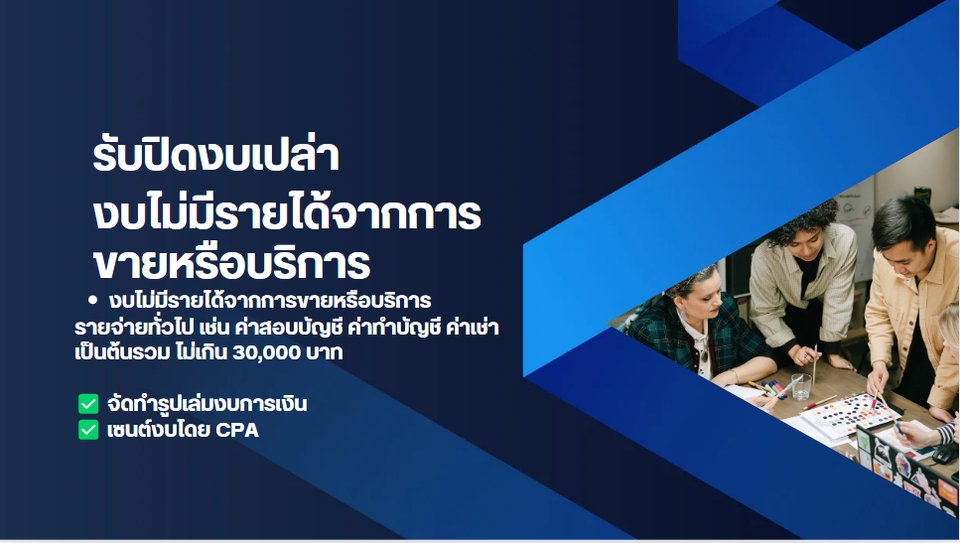 รับทำบัญชียื่นภาษี ประจำเดือนและประจำปี - บริการให้ทำบัญชี ยื่นภาษีที่เกี่ยวข้องกับกิจการ เช่น ภพ.30 ภงด.1 ภงด.3 ภงด.53 ประกันสังคม - ปิดงบประจำปีและนำส่งงบการเงินกรมสรรพากร (ภงด.50) และ กรมพัฒนาธุรกิจการค้า (สบช.3) - นำส่งบัญชีรายชื่อผู้ถือหุ้น (บอจ.5) - จัดทำงบรายเดือน ( ถ้ามี) - ให้คำปรึกษาทางบัญชีและภาษีอากร ขั้นตอนการทำงาน 1. แจ้งรายระเอียดความต้องการจ้าง 2. ขอรายระเอียดเบื้องต้น เช่น รายได้ประมาณเท่าไหร่ ค่าใช้จ่ายประมาณเท่าไหร่ งบปีไหน 3. ขอข้อมูลเบื้องต้นในการทำงบการเงิน/ตรวจสอบ (เช่น TB, Bank Statemnet, เอกสารยื่นภาษี เป็นต้น) 4. ใช้เวลาจัดทำ + เซ็นต์งบโดย CPA (10-15) 5. ตรวจสอบและทำการจัดส่งงบ