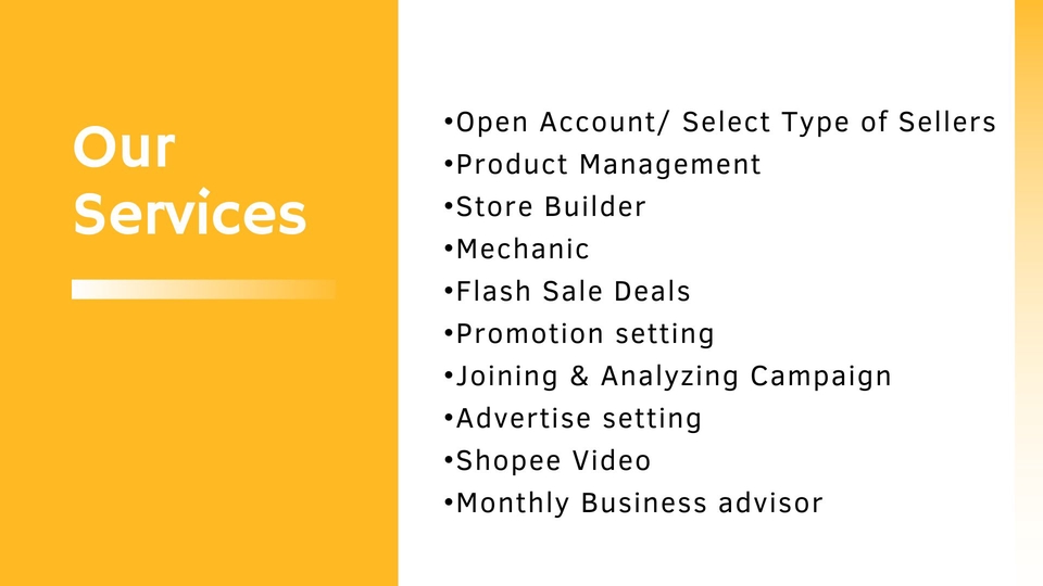 บริการดูแลร้านค้าออนไลน์ Shopee,Lazada,Tiktok วิเคราะห์ธุรกิจ พร้อมทั้งให้คำแนะนำด้าน Marketing เพื่อเพิ่มยอดขาย โฆษณา แนะนำด้านการสร้างโปรโมชั่นเพื่อดันยอดขายและวิเคราะห์สินค้า ขั้นตอนการทำงาน 1. ชำระเงินเพื่อเริ่มงาน 2. พูดคุยรายละเอียดงาน และตั้งค่าให้ทางเราเป็นแอดมินเพื่อเข้าไปดูแลร้านค้าออนไลน์ 3. นำเสนอแผนงาน ในส่วนของการสร้างโปรโมชั่น แคมเปญ (เผื่อส่วนลดสินค้าไว้ด้วยเพื่อเข้าร่วมโปรโมชั่น) และวิเคราะห์งบประมาณในการยิง Ads (ถ้าต้องการยิง Ads ด้วย)