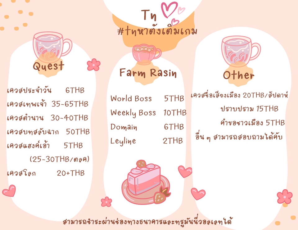 รับจ้างเคลียร์เควส ลงคอนเท้นต์เอนเกมส์ ดูแลไอดี (ในส่วนของการเคลียร์แมพสามารถมาตกลงพูดคุยกันก่อนได้เนื่องจากต้องใช้เวลา บางครั้งเลยไม่สามารถรับได้/แมพ Star rail สามารถเคลียร์ให้ได้) ขั้นตอนการทำงาน 1. ตามสั่งที่ลูกค้าต้องการ 2. อาจจะใช้เวลาแล้วแต่ที่ลูกค้าต้องการให้ทำอะไร